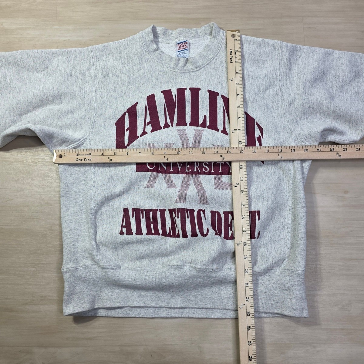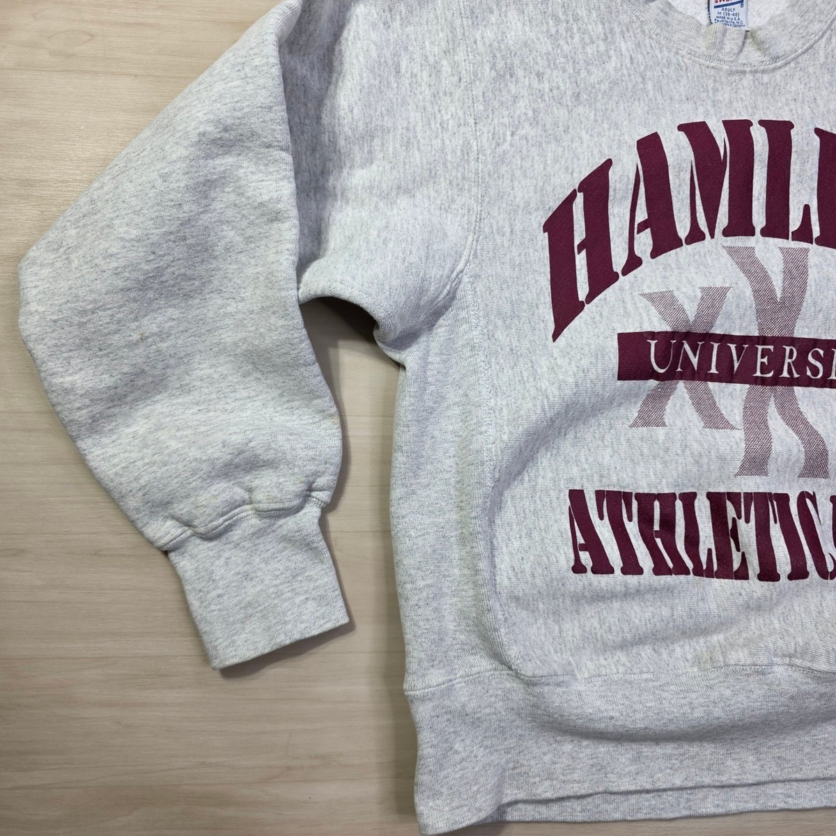 Keywords: Hamline University, college sweatshirt, vintage apparel, athletic wear, crew neck, maroon graphic, pullover, retro, varsity, school spirit, fall fashion