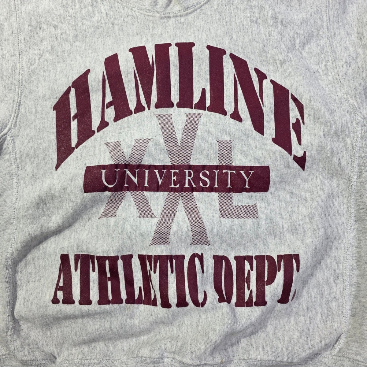Vintage Hamline University Athletic Dept sweatshirt in grey with maroon lettering. Features "Hamline University" arched across the chest with "XXL" and "Athletic Dept" below. Crew neck and long sleeves with ribbed cuffs and hem. Classic sweatshirt construction perfect for casual wear.
