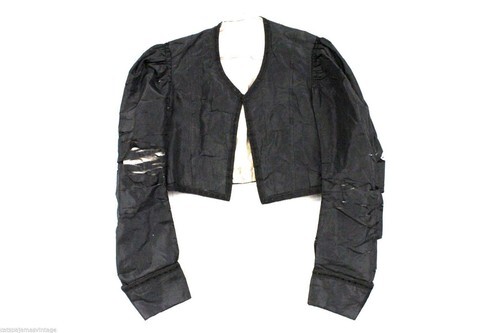 Antique / vintage 4-piece black silk set in distressed condition ? includes 1 blouse, 2 skirts, and 1 vest, all in various shades and textures of aged black. Ideal for Steampunk, Gothic Lolita, Dark Academia, or Costume Reconstruction. True Victorian or Victorian-inspired garments with decay and patina perfect for theatrical or avant-garde styling.