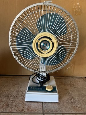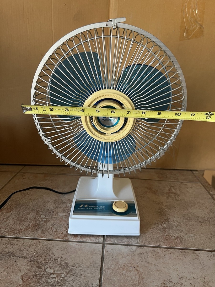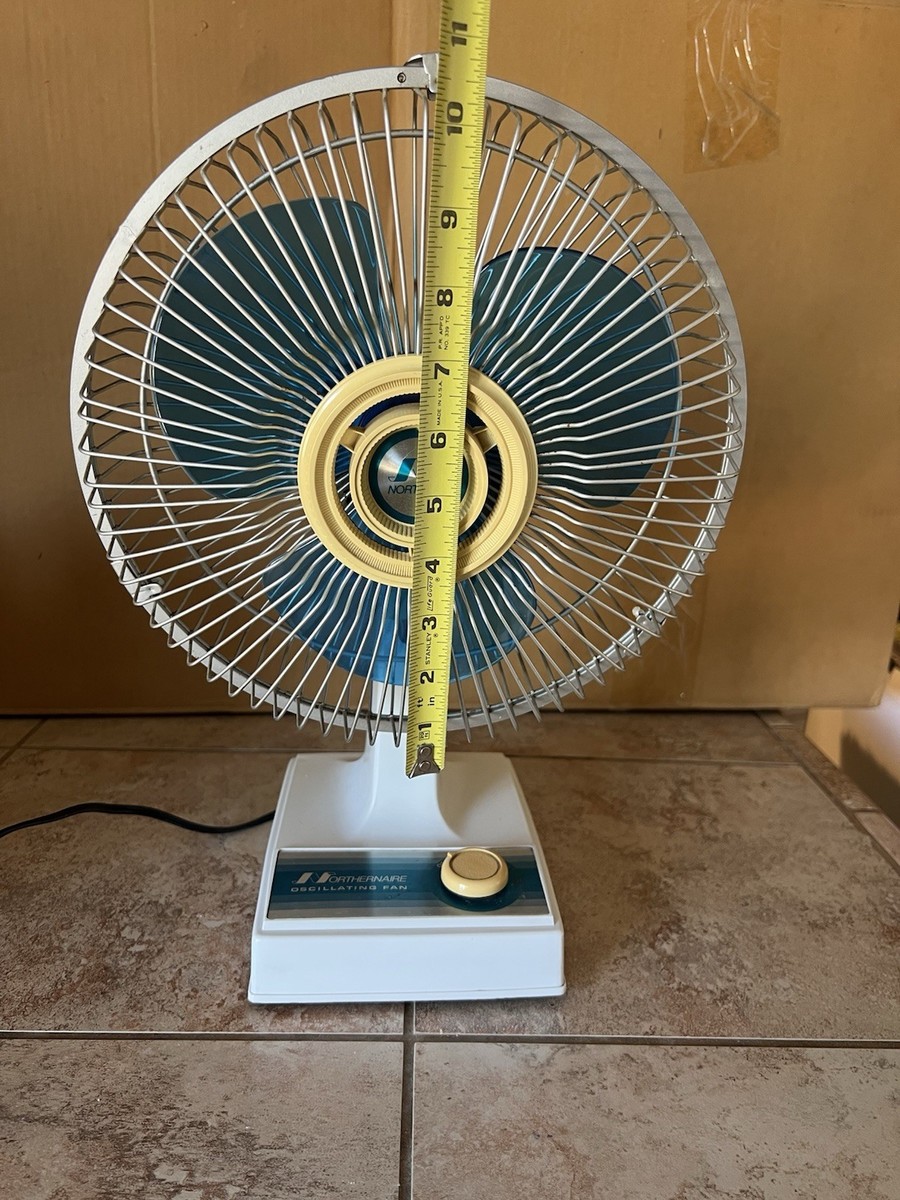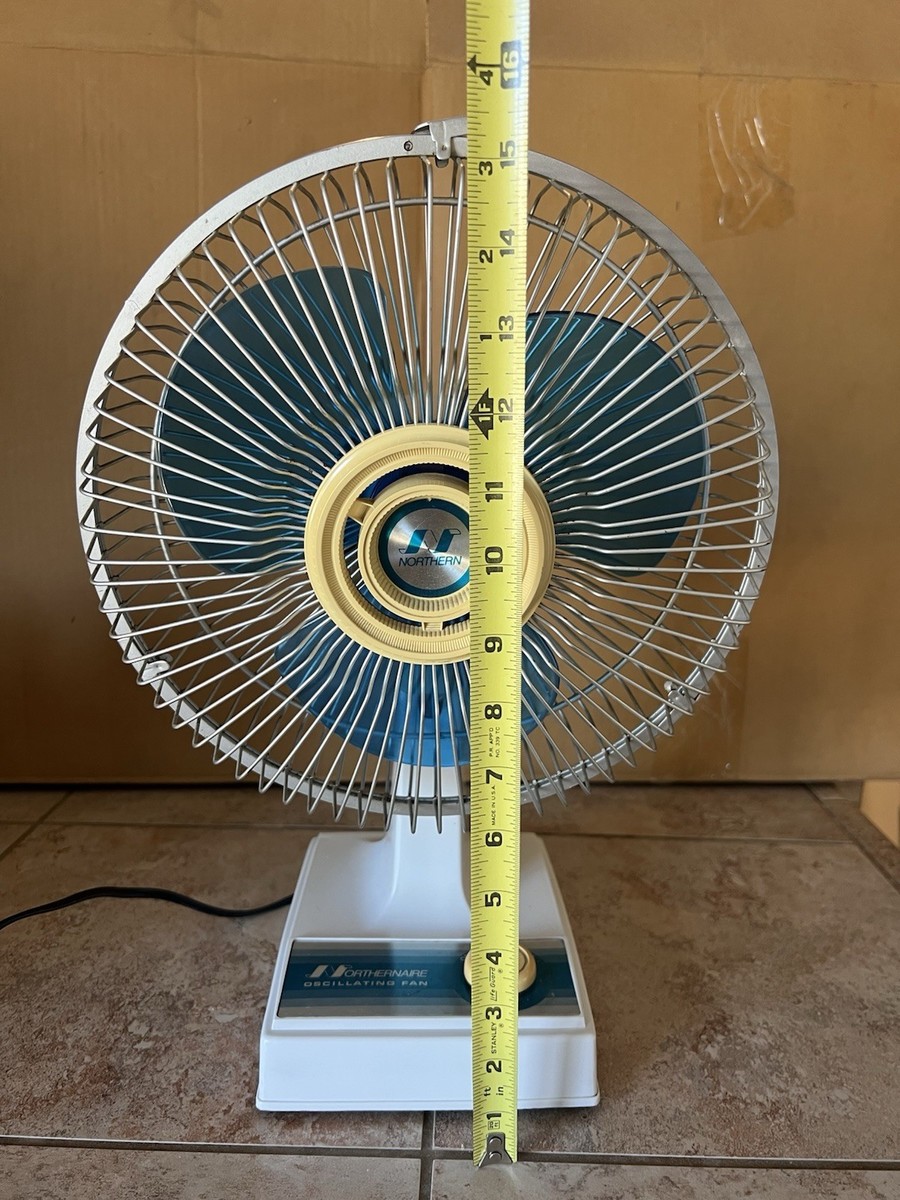 Vintage Northernaire Oscillating Fan Model 2909 with 9-inch blue blades and a classic retro design. Made in Korea by Northern Electric Co., a division of Sunbeam Corp. The fan powers on and runs smoothly, but the oscillation feature no longer works. Measures approximately 16 inches tall from base to top, 11 inches wide, and 8 inches deep. Features a sturdy metal safety grille, single-speed control, and original cord. Perfect for collectors of vintage appliances or mid-century decor. Shows light cosmetic wear consistent with age, including minor scuffs on the base. Tested and working - not oscillation.