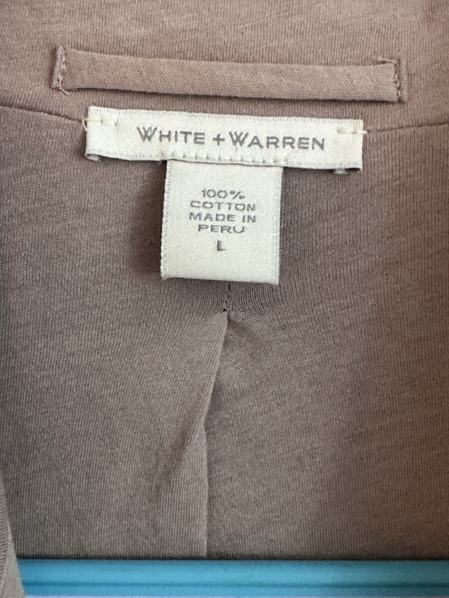 The White + Warren Cotton Blazer Jacket in Tan is a stylish and versatile piece for women in size Large. Made from high-quality cotton with a knit fabric type, this mid-length jacket features a double-breasted button closure, perfect for casual or business occasions. The tan color and blazer style add a touch of sophistication to any outfit, making it a must-have addition to any wardrobe.