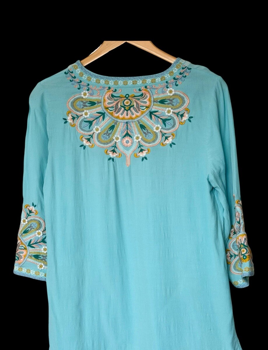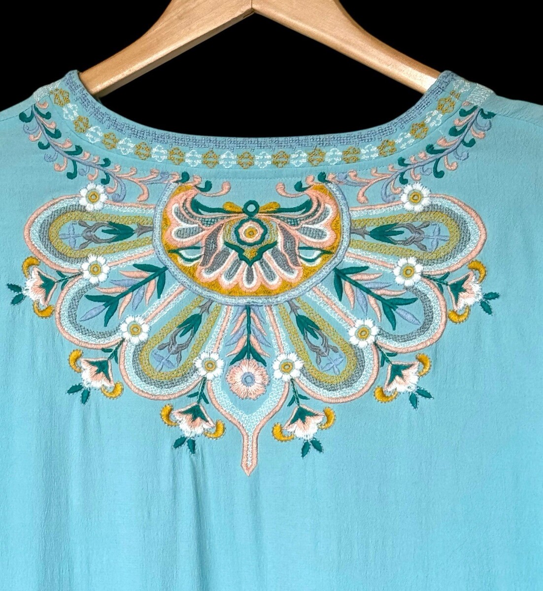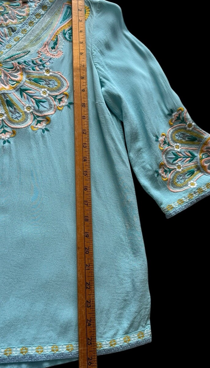 Soft Surroundings Blue River Island Top Size Medium Tunic Embroidered Aquamarine