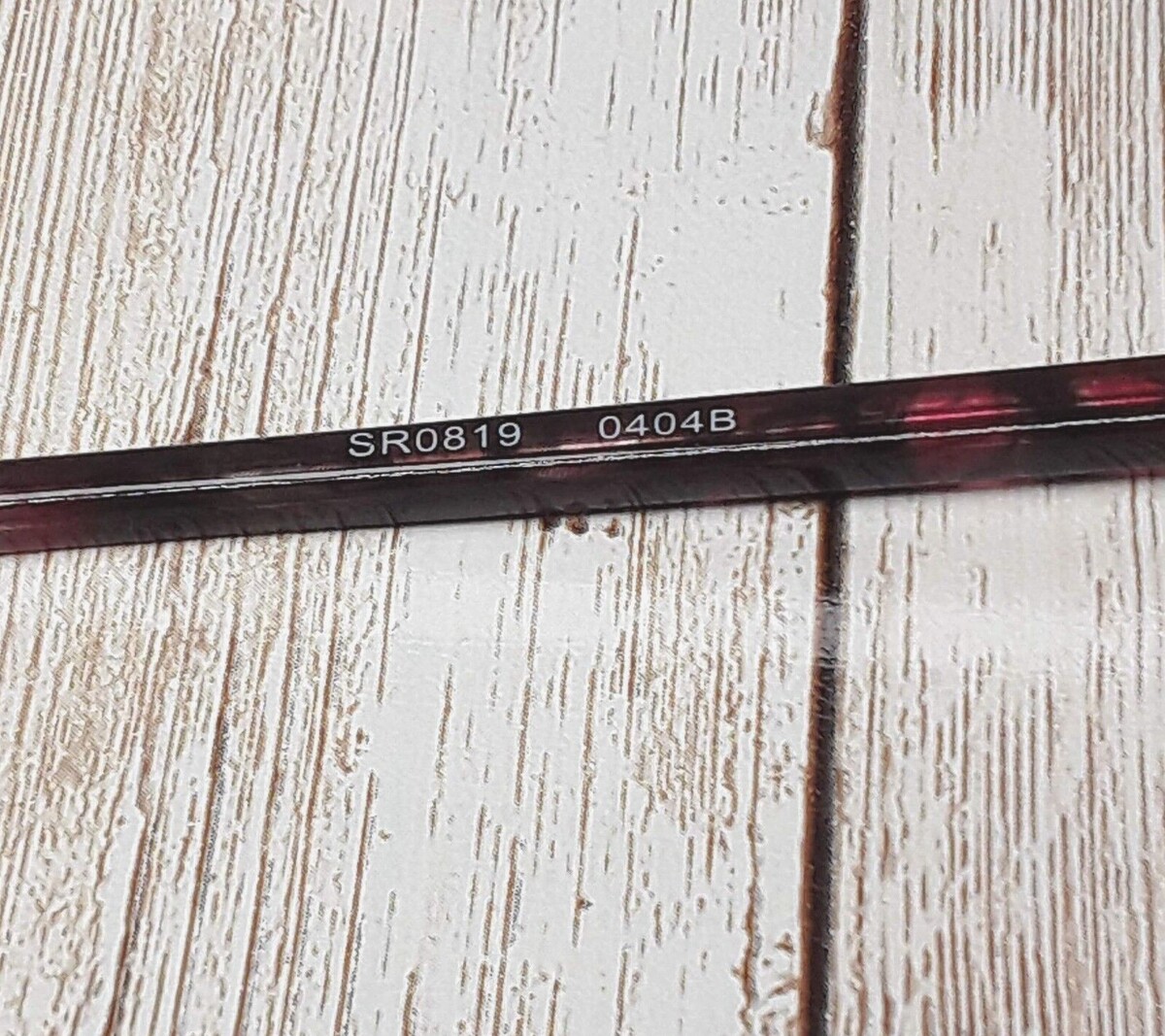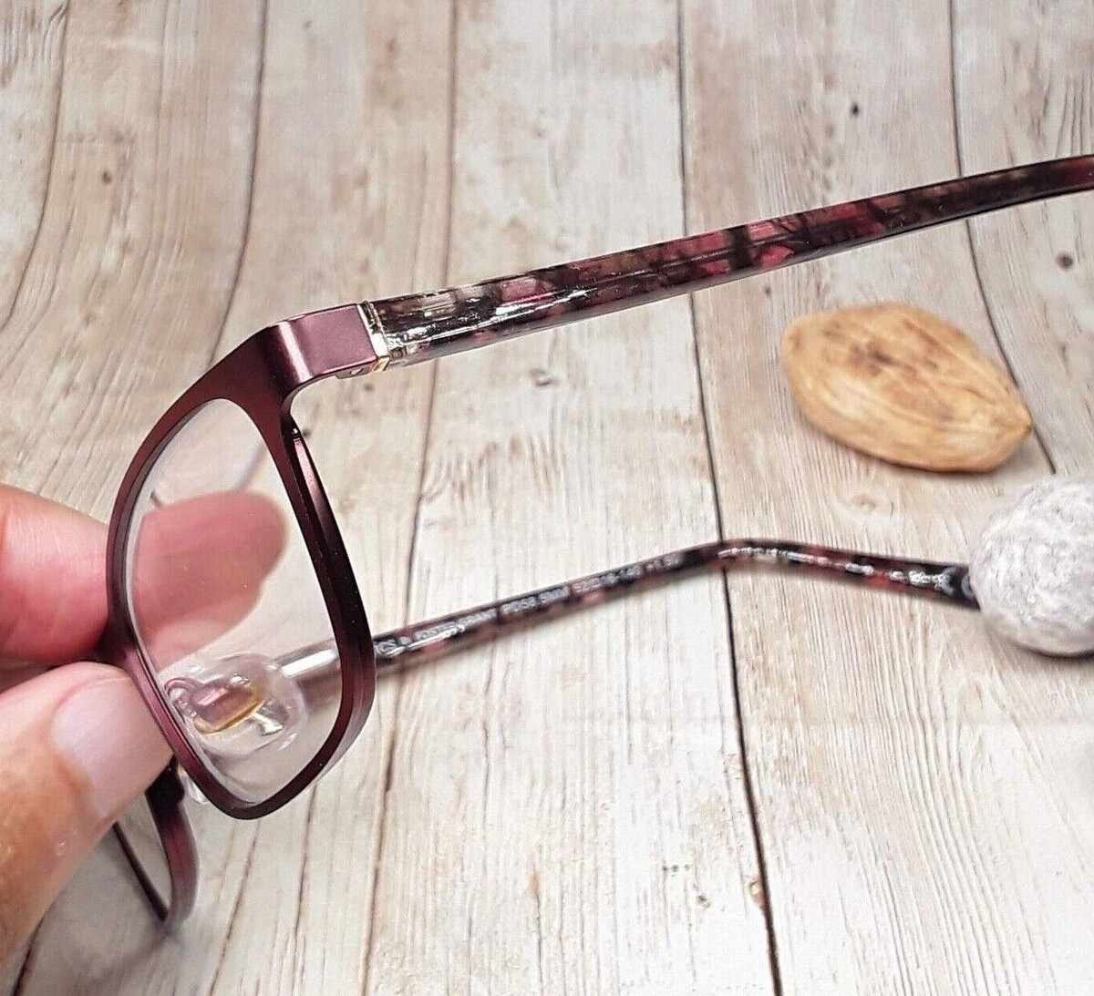 Brushed dark red metal frame. High gloss multi-colored temple arms.