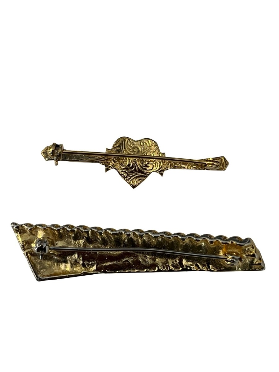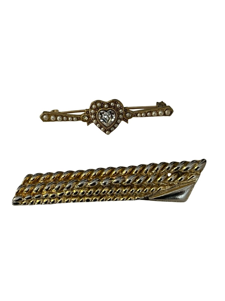 Vintage brooch set featuring a detailed heart-shaped pin with faux pearls and a faceted rhinestone center, paired with a bold textured bar pin in a two-tone gold and silver finish. Classic elegant pieces with versatile styling?perfect worn together or separately for both formal and everyday looks.