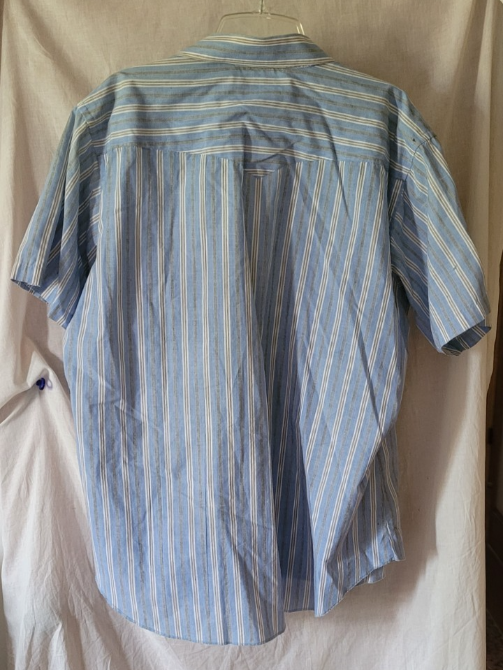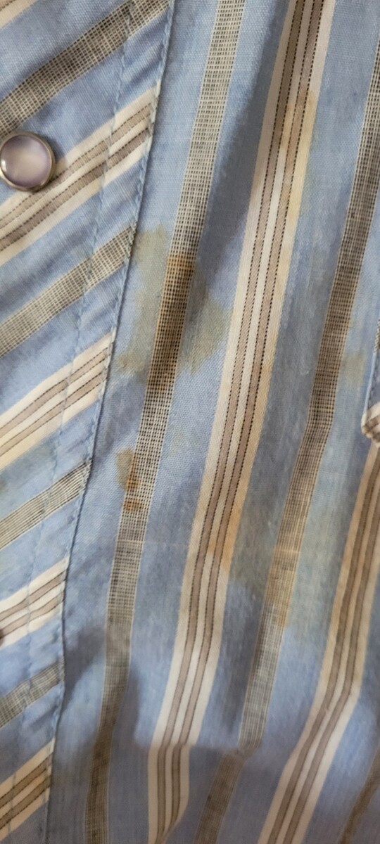This shirt is in good/fair used condition. There is a spot on the front as seen in the photos. All of the snaps work well. The size is 17.5. Measurements are approximately: Length: 30 inches from shoulder to hem. Pit to Pit: 27 inches.