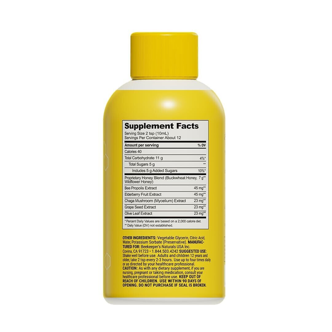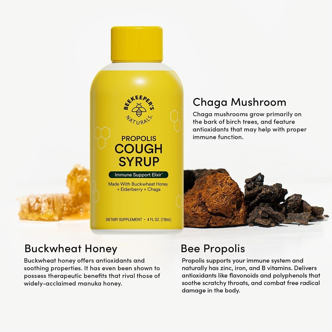 Expiration Date of 1/2027 ? NATURAL COUGH SYRUP: Feel like yourself again with this blend of immune-supporting and super-soothing ingredients that help you bounce back and recover while soothing dry, scratchy throat and dry coughs. ? CLEAN NATURAL INGREDIENTS: Formulated with natural and plant-based ingredients like buckwheat honey, elderberry, chaga, and bee propolis to help you get back on your feet kick your immune system into gear. ? IMMUNE SUPPORT: When it comes to immune support, you can't beat nature's remedies. With ingredients like raw honey and elderberry extract, Beekeeper?s Naturals cuts zero corners to formulating the purest effective remedies. ? CLEAN COUGH SYRUP: Our natural daytime cough syrup is formulated with clean ingredients from the hive and nature! B.Better Daytime Cough Syrup for Adults is your clean cough syrup and natural remedy that supports respiratory comfort, provides sore throat relief and immune support. ? POWERED BY NATURE: We're all about efficacy! We aren?t just creating cleaner alternatives to the traditional medicine cabinet; we?re creating all-around cleaner products. We merge modern science with natural medicine to create natural remedies that actually work. ? Product packaging may vary as we refreshed our packaging and are currently transitioning between old and new packaging. Our ingredients formula that you know and love remain the same!