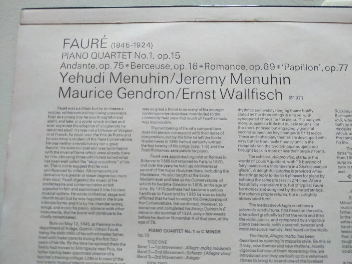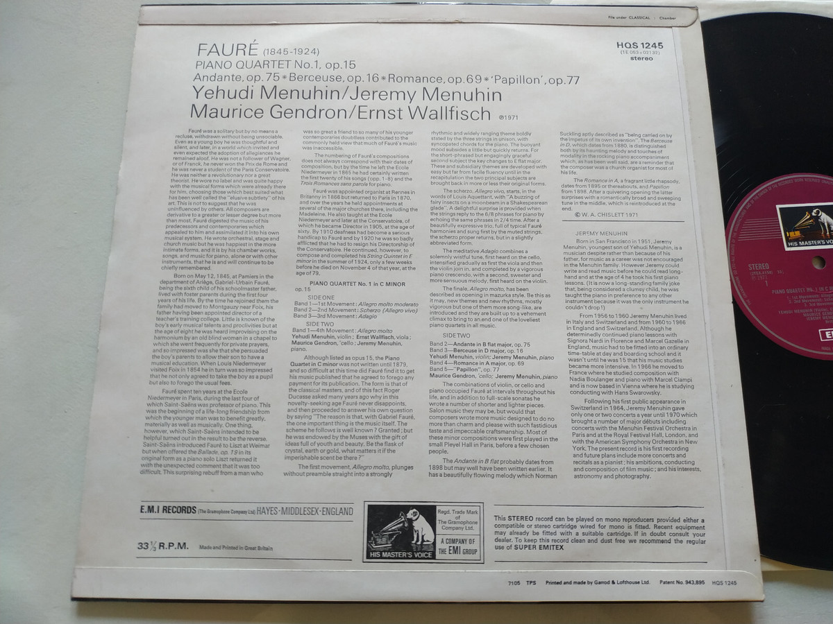 Faure Piano Quartet No 1 Yehudi Jeremy Menuhin 1971 EMI - LP 12 " Vinile VG / VG AM