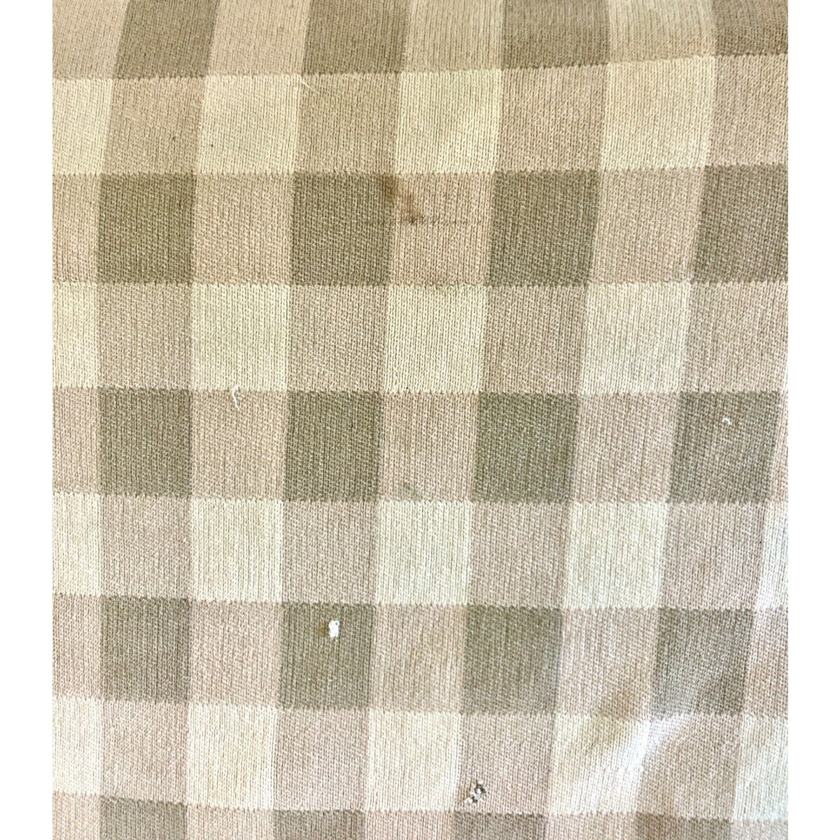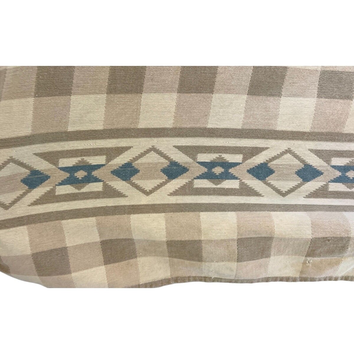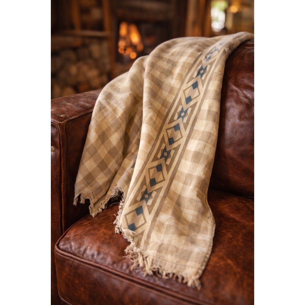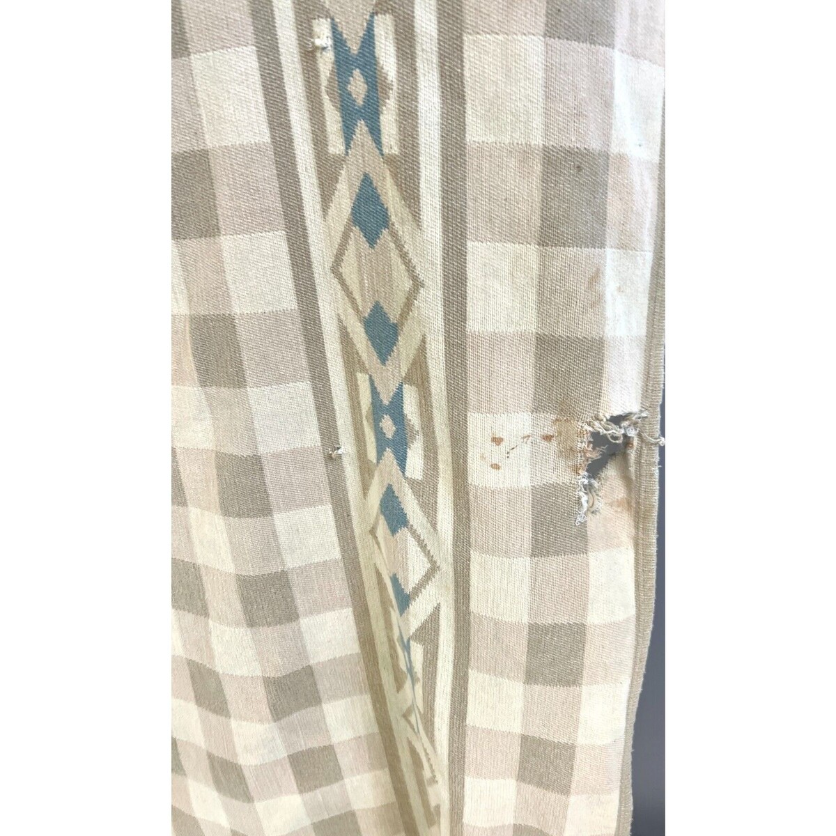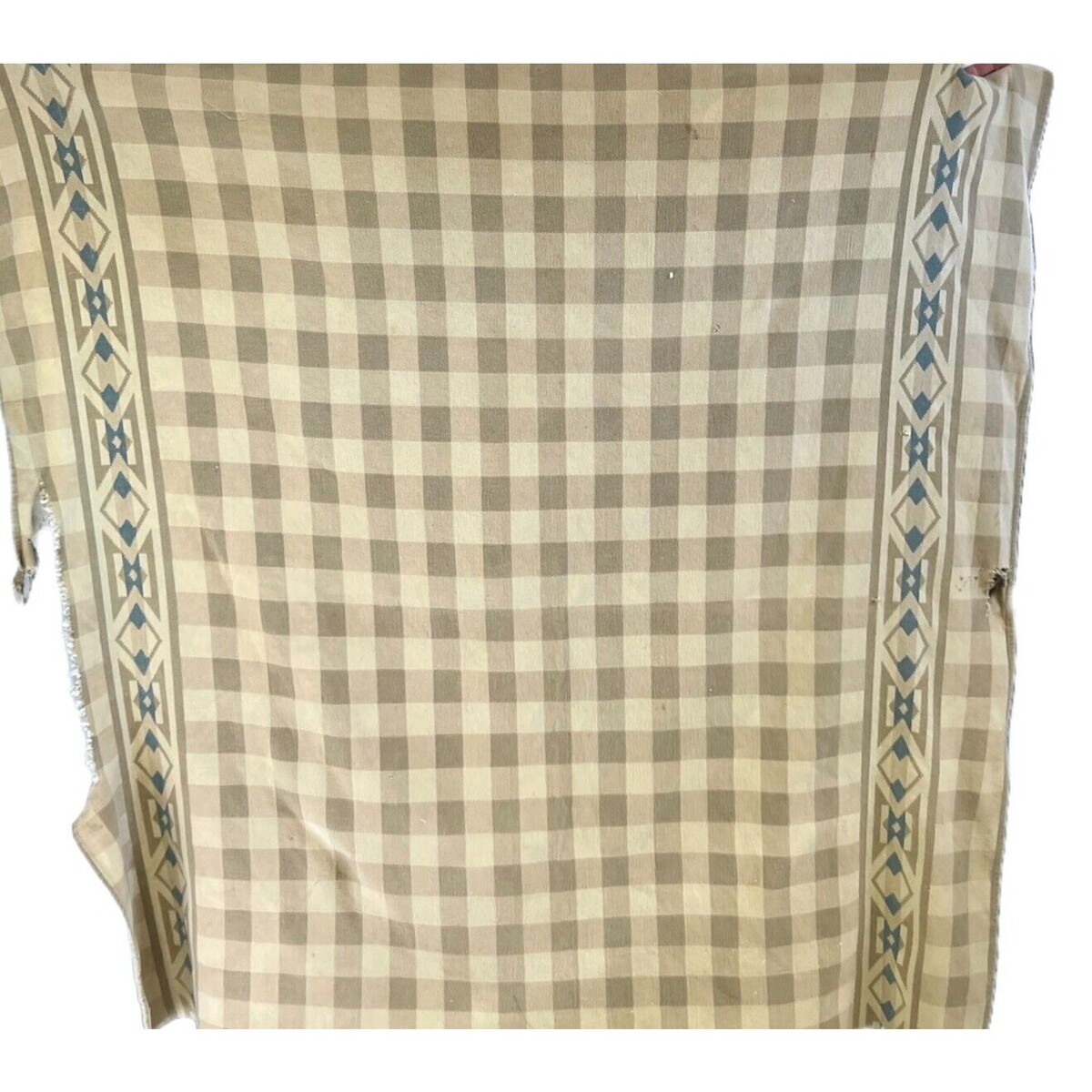 What you?ll love about this 1940s reversible camp blanket is the striking geometric Deco border paired with classic neutral gingham. The beige and soft taupe check field contrasts beautifully with the blue diamond motif border, giving it that rugged Americana lodge aesthetic with subtle Art Deco influence.