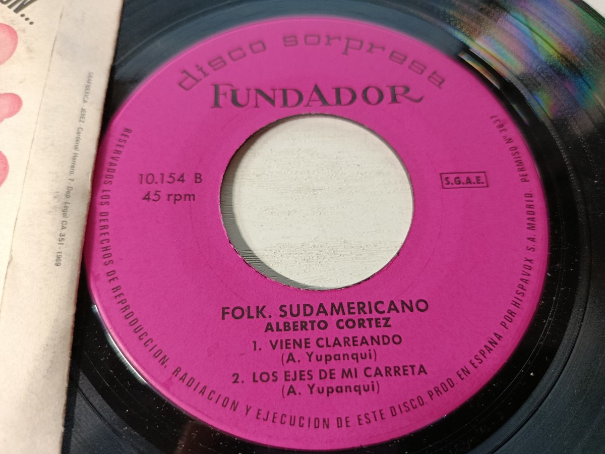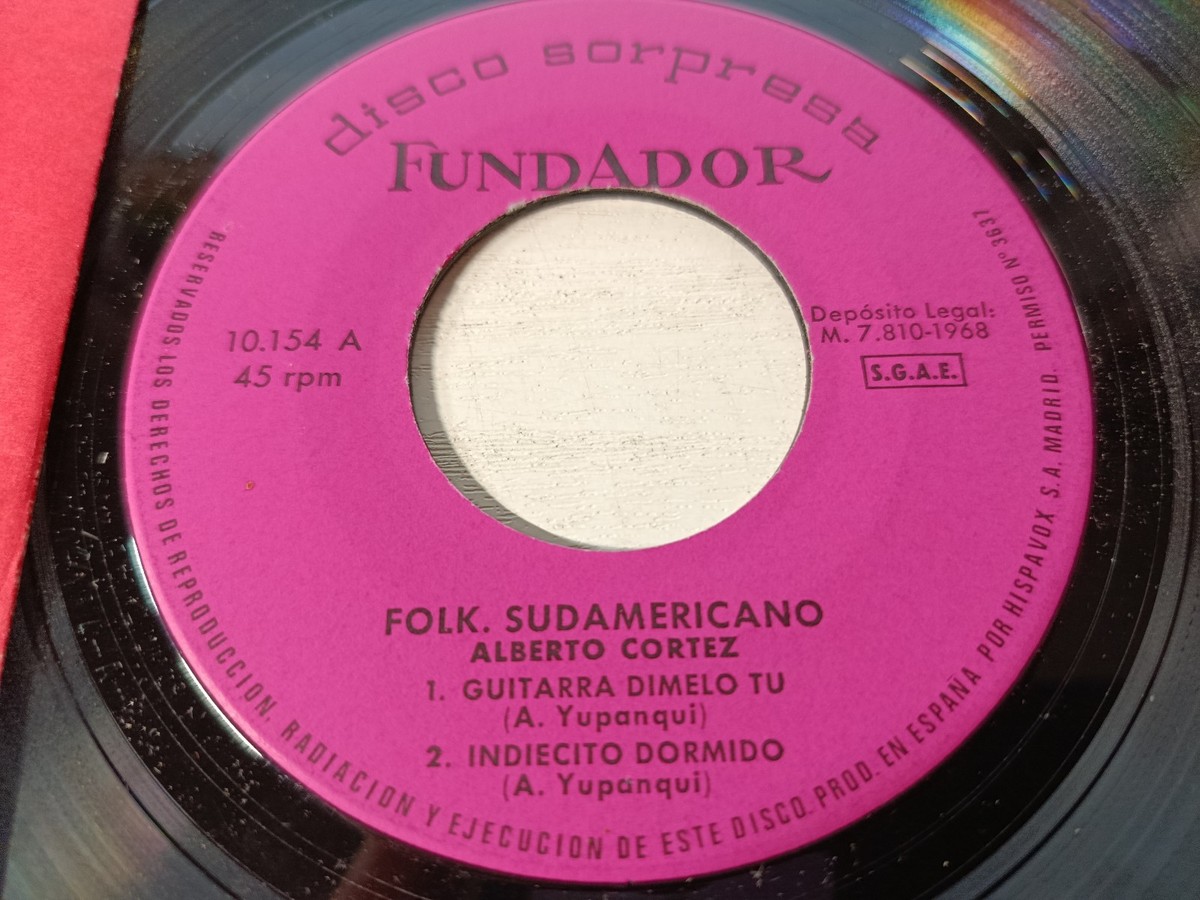 Alberto Cortez, Folk sud-americain, Disco Sorpresa Fundador, Hispavox, 1968, vinile 7 pouces, single promotionnel, Atahualpa Yupanqui, musique argentine, folklore latino-americain, Pedro Domecq, Fundador Domecq, publicite vintage,vinile ancien, collection retro, vinyle espagnol, rarete collector, single d'Alberto Cortez, guitare dímelo tú, Indiecito dormido,Los essieuxde mon panier, Il fait jour, musique traditionnelle, Fundador Jerez, edition promotionnelle