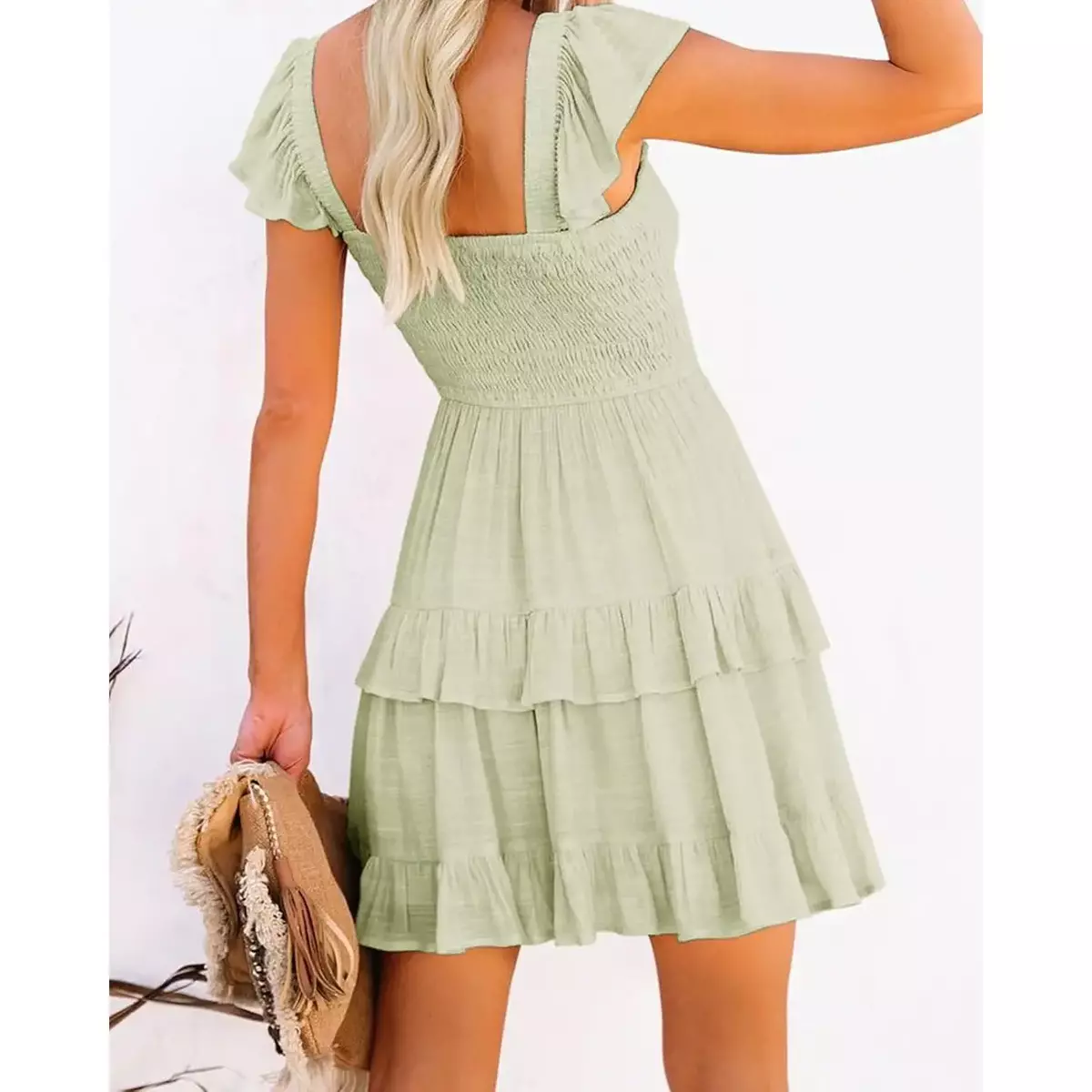Women's Summer Ruffle Dresses Elastic Empire Waist A-line Layered Swing Flowy Mini Dress (lightgreen)