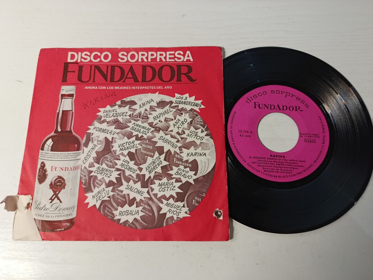 Karina, Disco Surpresa Fundador, Hispavox, 1970, single promotionnel, vinile 7 pouces, Waldo delos Ríos, pop espagnole, Pedro Domecq, Fondateur Domecq,El chemin jaune, Les flechesdelamor , Tu reviendras,El troncde losrecuerdos , rarete collector, musique des annees 70,vinile vieux, publicite vintage, collection retro, vinyles Espagne, Fundador Jerez S'il vous plaît, si vous recevez el ar