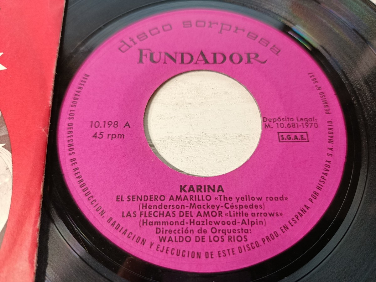Karina, Disco Surpresa Fundador, Hispavox, 1970, single promotionnel, vinile 7 pouces, Waldo delos Ríos, pop espagnole, Pedro Domecq, Fondateur Domecq,El chemin jaune, Les flechesdelamor , Tu reviendras,El troncde losrecuerdos , rarete collector, musique des annees 70,vinile vieux, publicite vintage, collection retro, vinyles Espagne, Fundador Jerez