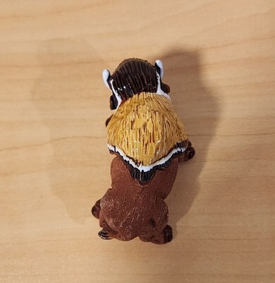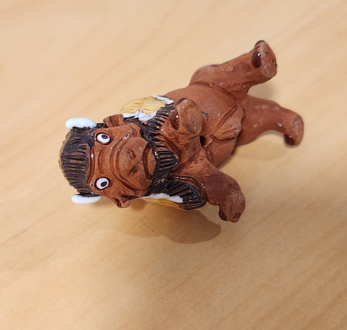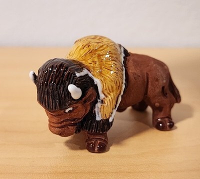 This is a charming, vintage-style 2-inch American Bison figurine, hand-painted and signed by the artist "Leps". It is made of ceramic (likely a red clay base) and features a detailed, glossy finish on the mane and head. This unique piece of folk art is in good pre-owned condition and would make a great addition to any animal or pottery collection.