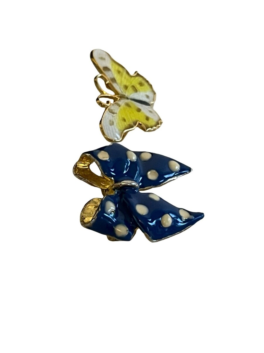 Set of 2 vintage enamel brooches including a blue polka dot bow and a yellow butterfly. Both feature gold tone metal with detailed enamel work. Fun, colorful pieces perfect for everyday wear or collectors.