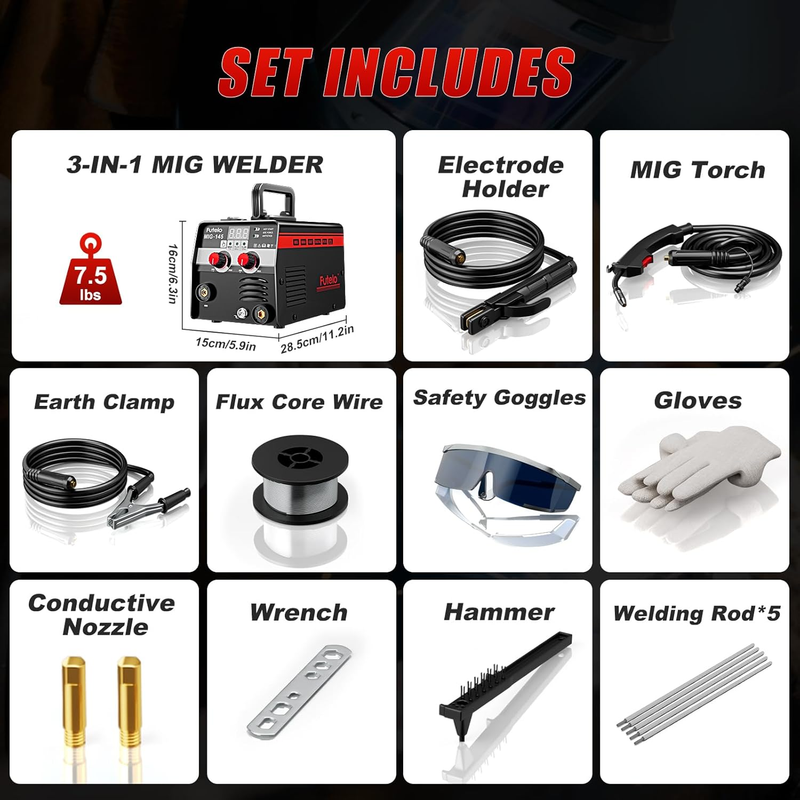 ?WHAT YOU WILL GET?Everything you need is in one box! Includes: 1*145A MIG welder 110V, 1*14AK MIG torch, 1* Ground clamp, 1*Electrode holder, 5* 2.5" Welding rods, 1*0.9mm flux core wire, 2* Contact tips, 1* Wrench, 1* Safety goggles, 1*Pair of gloves, 1*Hammer and 1* User manual. Plug it in and start your first project within minutes?no extra purchases required