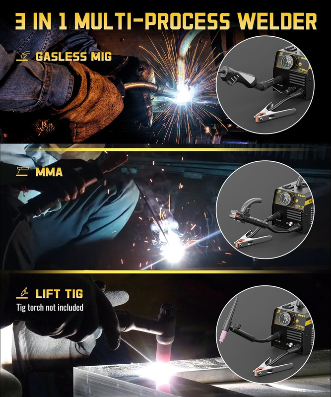 MULTIPROCESS WELDER: This electric welder is your go-to for flux core MIG, MMA and lift TIG welding capabilities(additional WP17V TIG torch required). Perfect for carbon steel, stainless steel, and thicker materials, it's the ideal choice for home DIY projects, outdoor repairs and farm maintenance