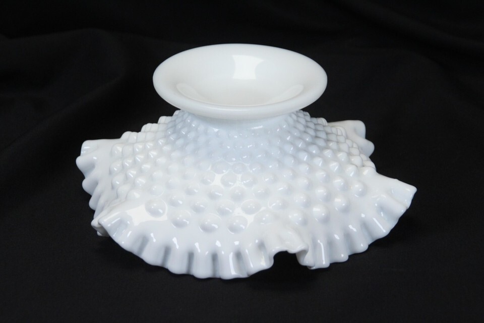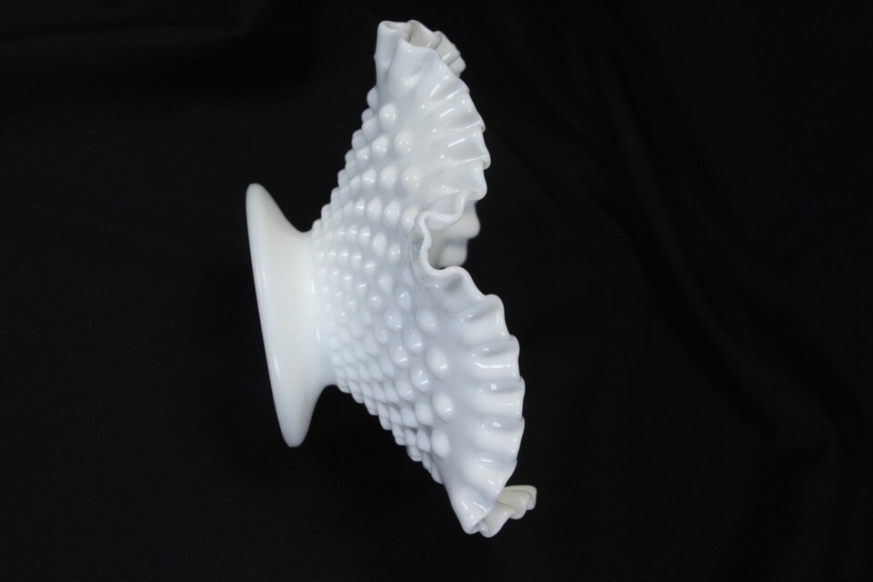 Fenton White Milk Glass English Hobnail Ruffled Candy Bowl 8-1/8" Wide Footed