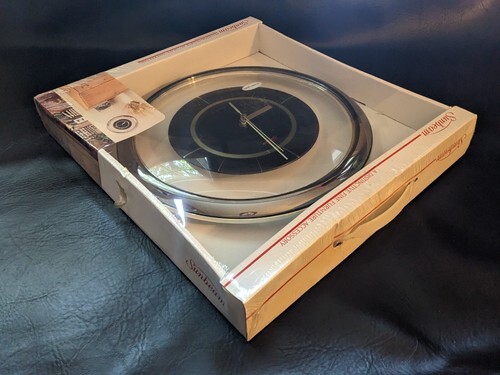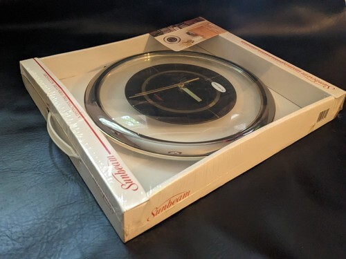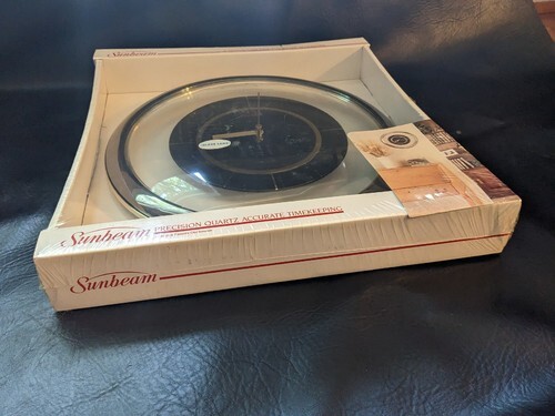 Up for sale is a new in box 1980 Sunbeam Round Gold Nickel Glass Quartz Analog Wall Clock 882-1744.