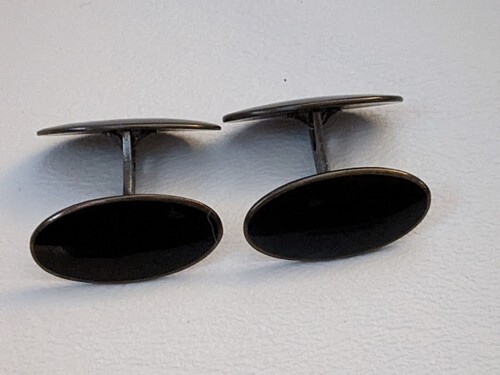 David Anderson Sterling Silver Oval Black Enamel Guilloche Cufflinks Vintage
