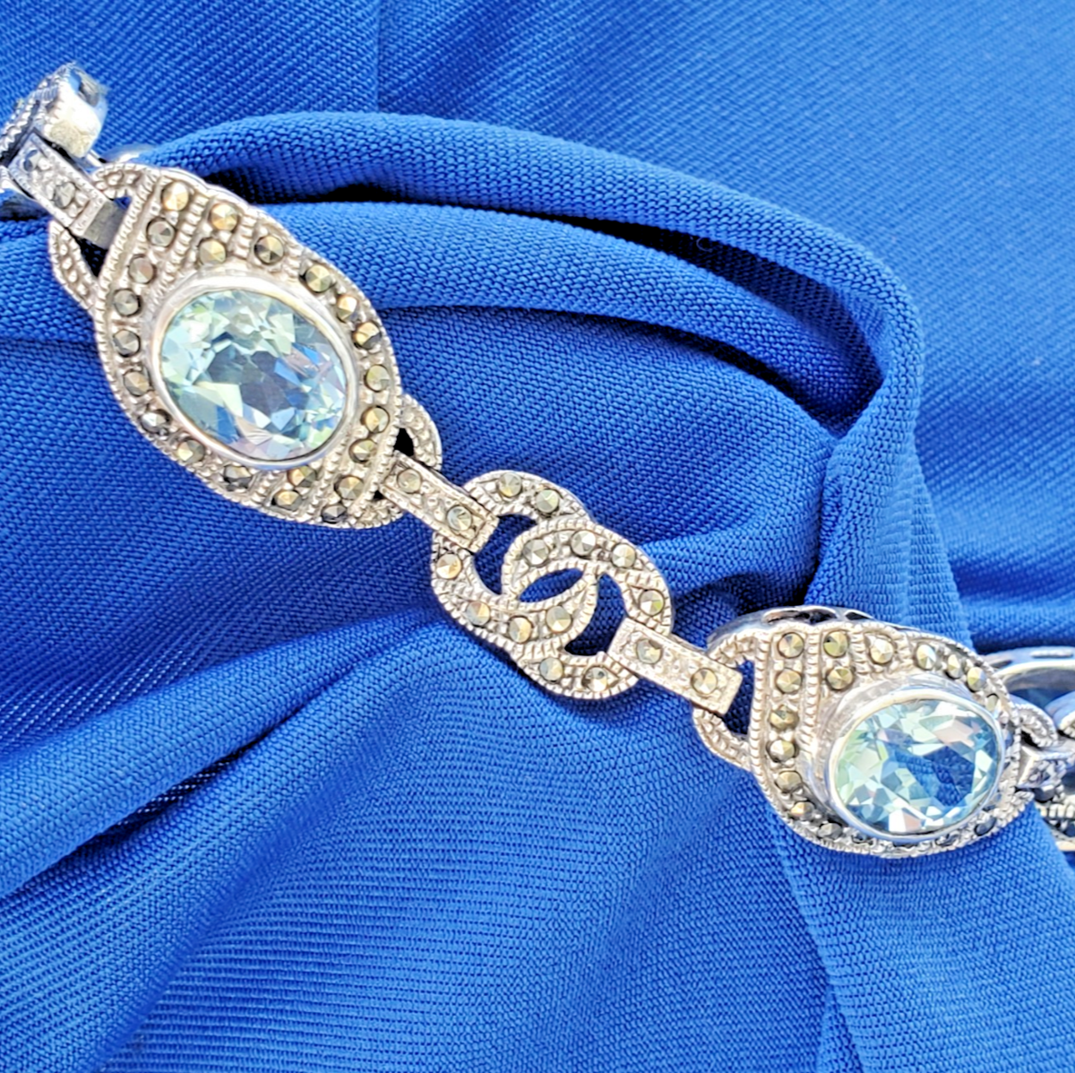 Designer 925 sterling blue topaz and marcasite original filigree chain link bracelet.