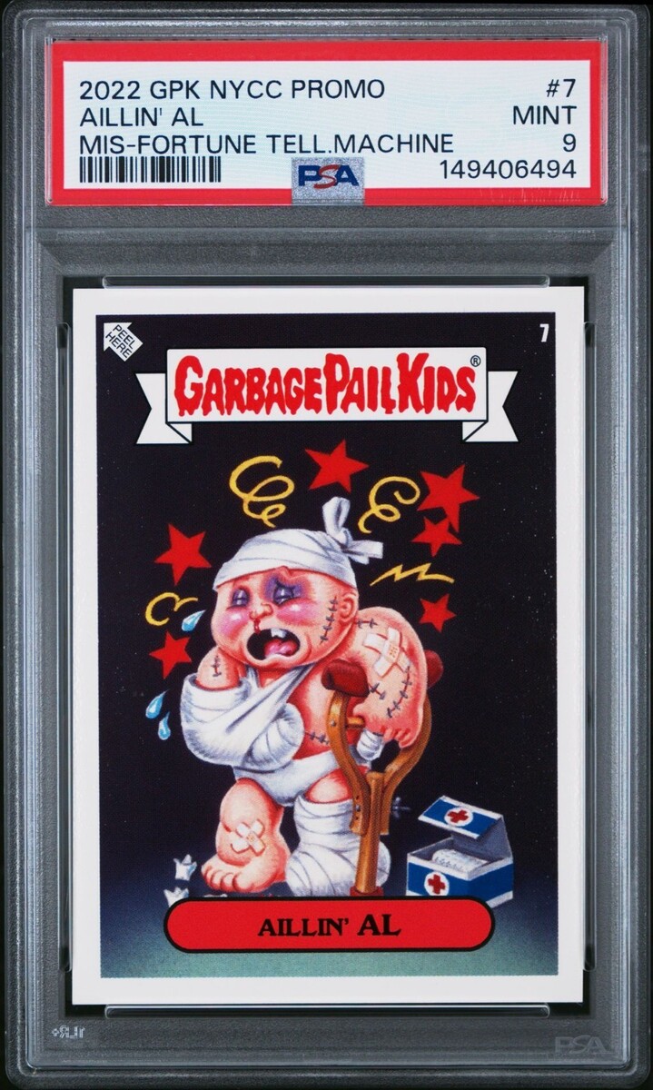 This is a TOPPS NY COMIC CON EXCLUSIVE AILLIN' AL Mis-Fortune Tell Machine #7 GARBAGE PAIL KIDS PROMO CARD. Itis Graded PSA 9 MINT It is a normal sized 2 1/2 inch by 3 1/2 inch card. This is a card does not have a sticker like a normal Garbage Pail Kids Card. VERY RARE EXCLUSIVE CARD only available at the Topps Booth at the 2022 Con. Very Few Available Graded Copies. Combine auctions to save on shipping. Please contact me if you need to make other payment arrangements. AG