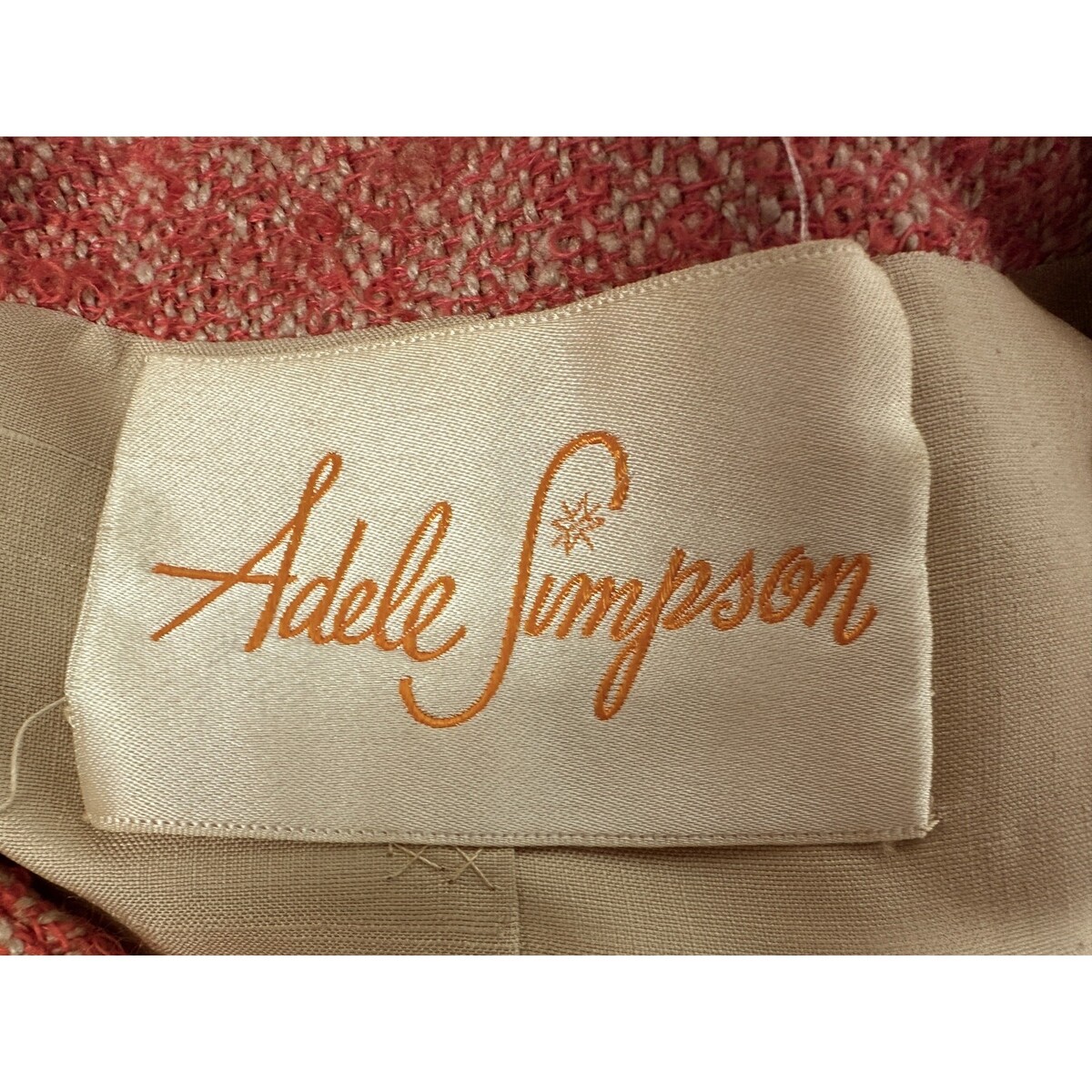 Boucle wool tweed in orange; brass buttons with loop closures; partial lining; small metal zipper at skirt; Adele Simpson label.