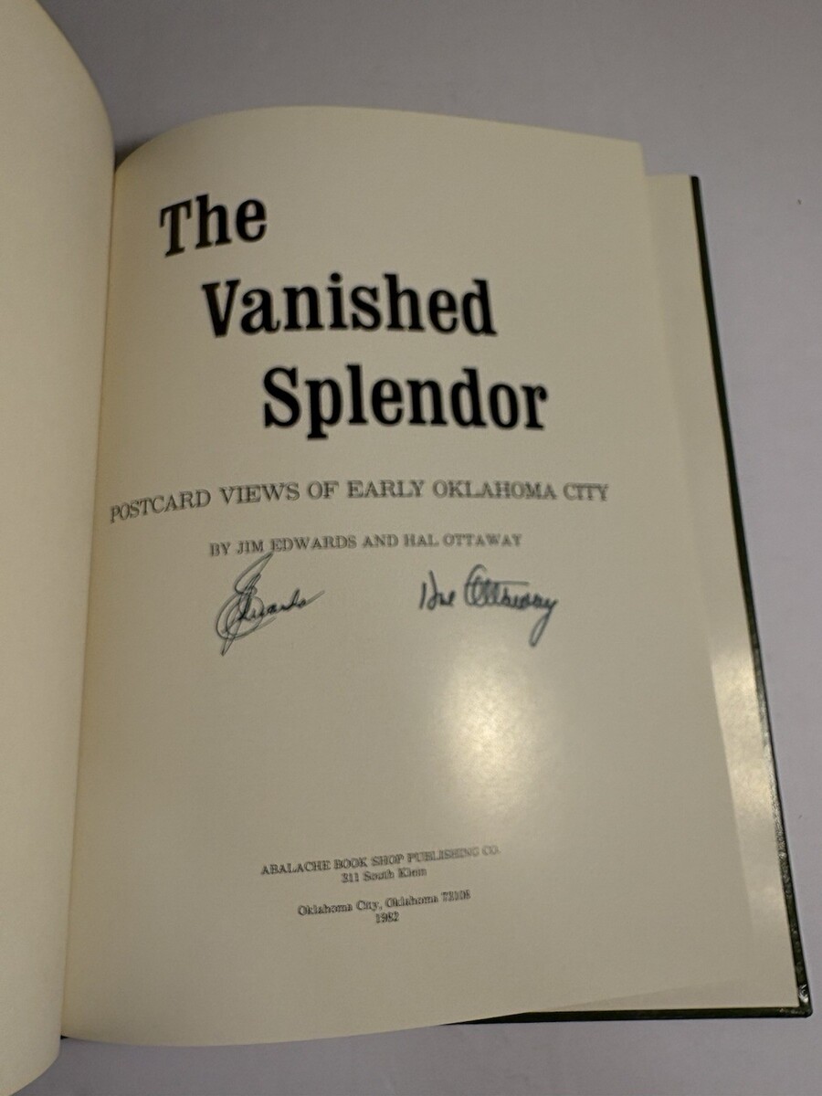 For sale is a rare and collectible first edition of *The Vanished Splendor: Postcard Views of Early Oklahoma City* by Jim Edwards and Hal Ottaway, published in 1982 by Abalache Book Shop Publishing Co. This book is a beautifully crafted tribute to the early architecture and history of Oklahoma City, featuring stunning postcard images and detailed commentary.