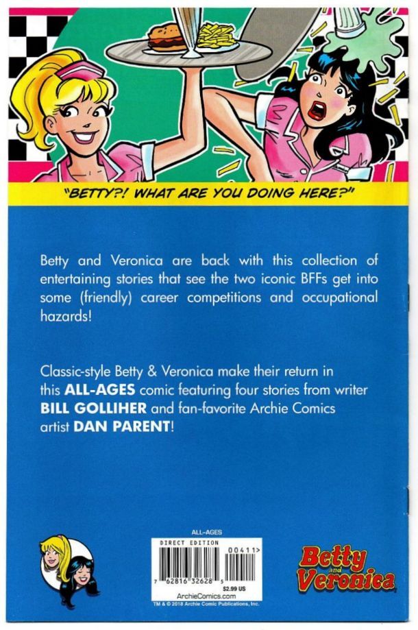 Description: Original cover price: $2.99. Direct edition. Written by Bill Golliher; Art Cover Art by Dan Parent; Inks by Rich Koslowski and Glenn Whitmore. Features 4 classic-style Betty and Veronica entertaining tales that see the two iconic ladies get into some (friendly) career competitions and occupational hazards! 20 pages, Full Color. 040326