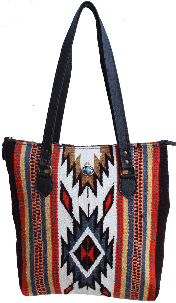 Challenger Women's handwoven wool western handbag with a double-sided southwest pattern. These extraordinary crafted bags measure approximately 15" wide x 17" tall giving you plenty of room for all of your essentials. Full closure zipper at the top.