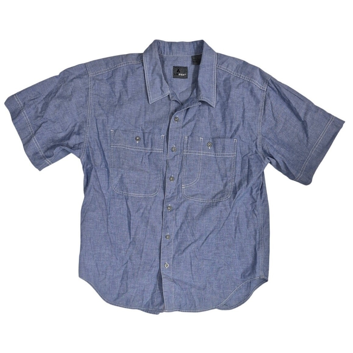 Classic vintage 1980s?90s Liz Wear chambray work shirt, crafted in 100% cotton. Designed in mid-weight denim blue with large patch pockets accented by white top-stitching. Straight hem, button front, and crisp construction ? a versatile wardrobe staple.