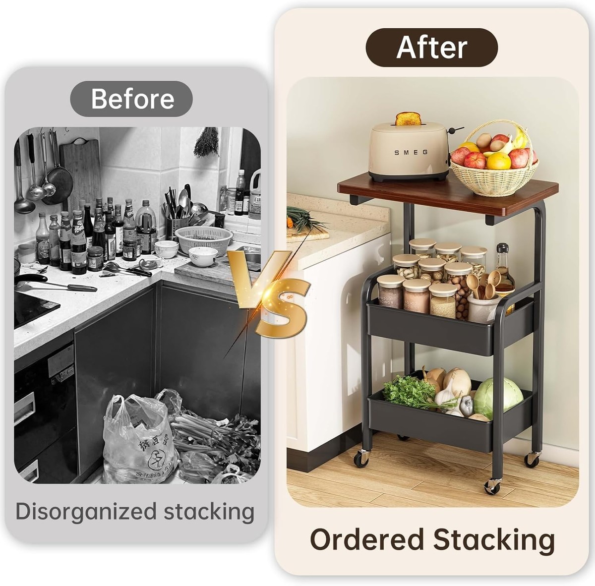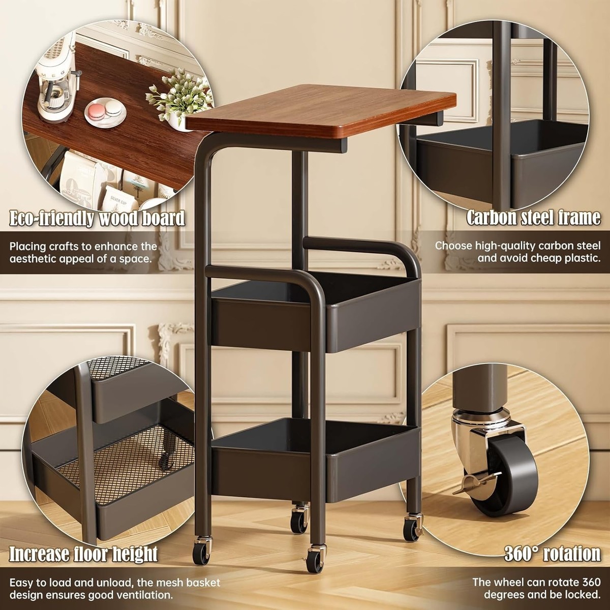 Stylish 3-Tier Utility Cart - Rolling Design with Lockable Wheels & Walnut Top