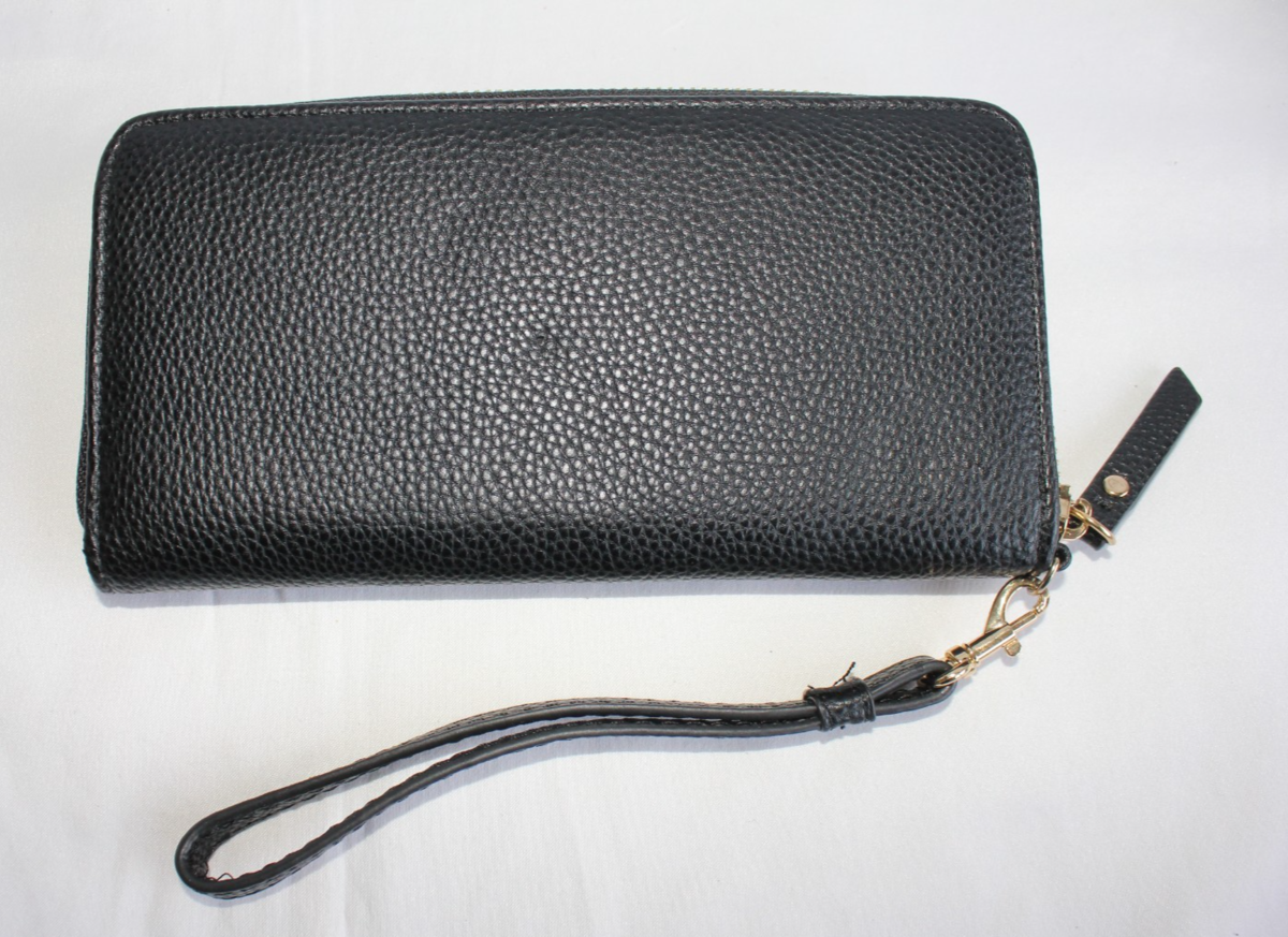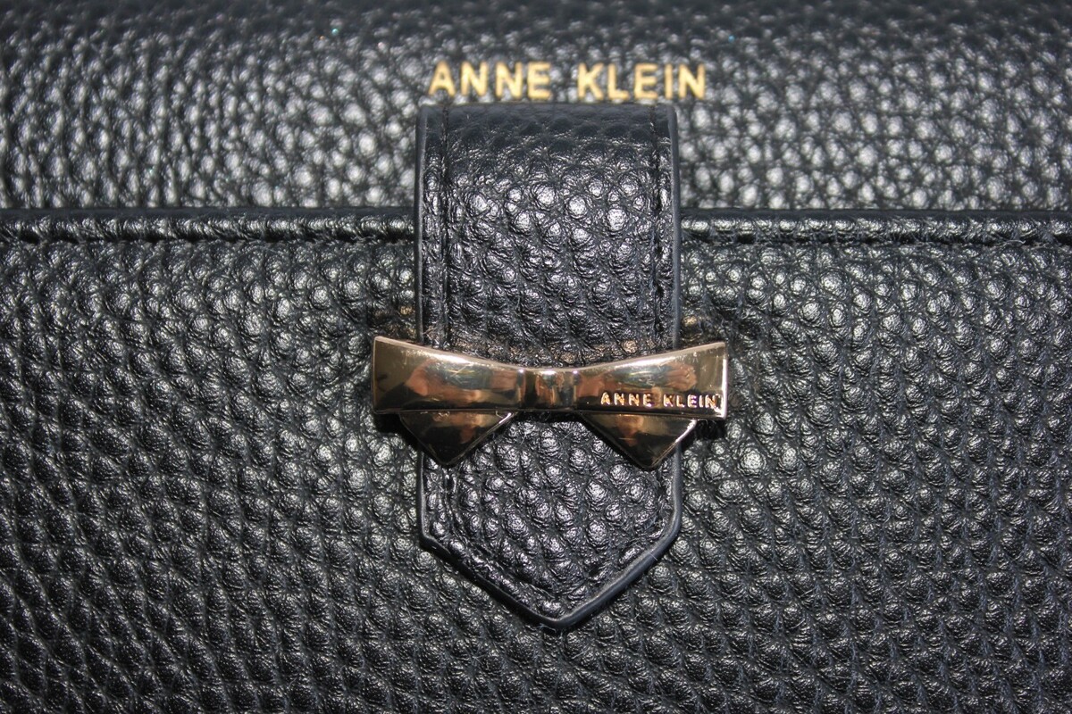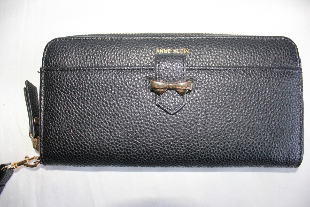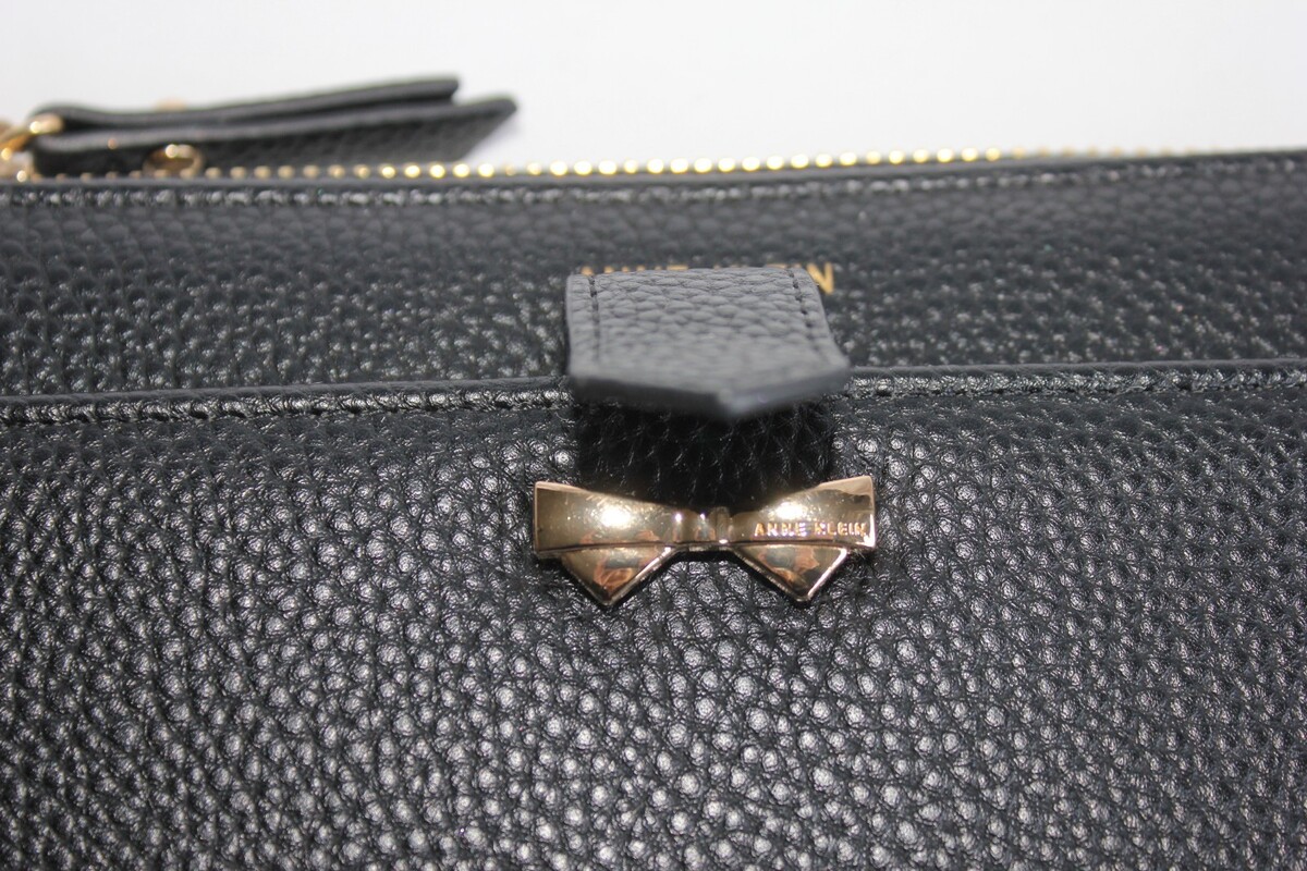 Anne Klein Black Zip Around Pebbled Leather Wristlet Gold Bow Buckle