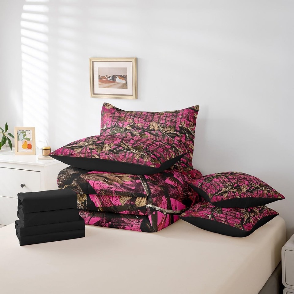 Feelyou Pink Camouflage Queen Comforter Set with Sheets All Purpose Camo 7 Piece