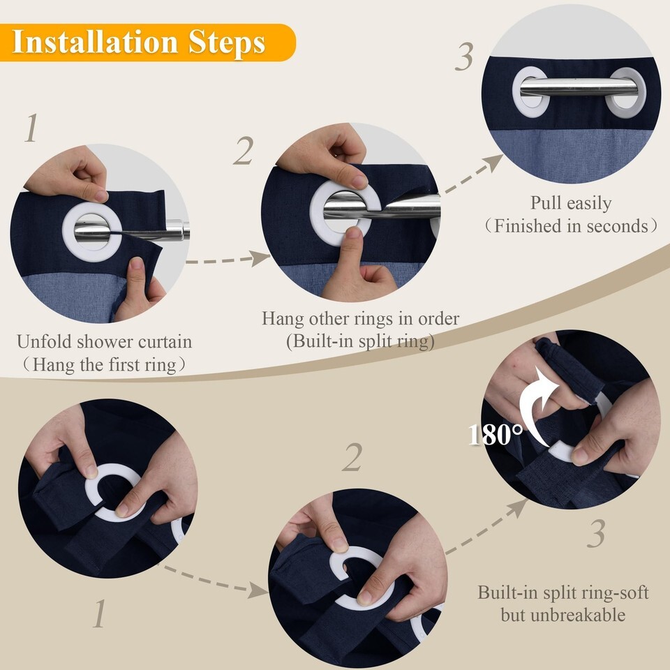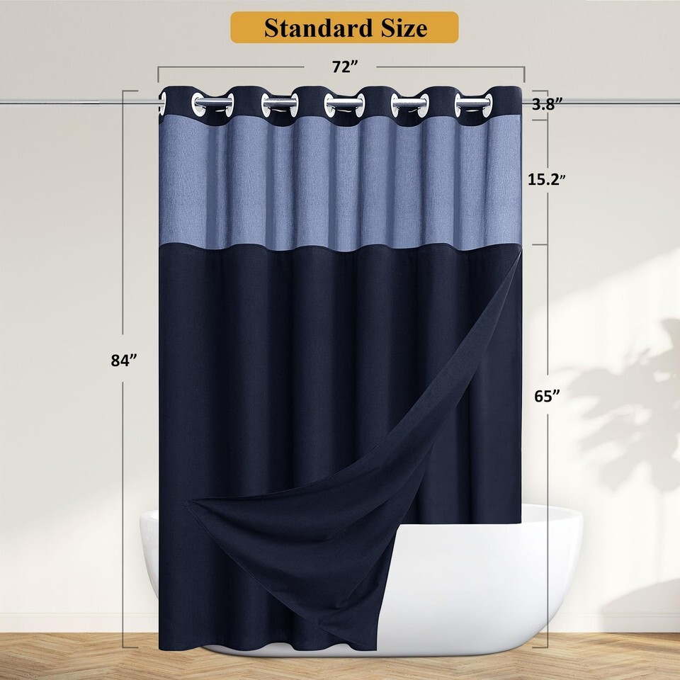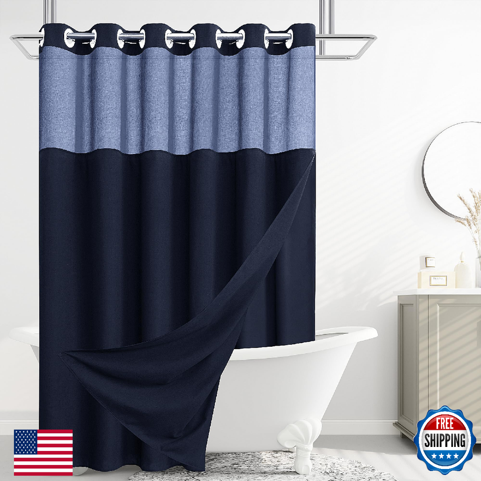 Jowels No Hooks Needed Linen Shower Curtain and Liner Set,Navy Blue Hotel Luxury