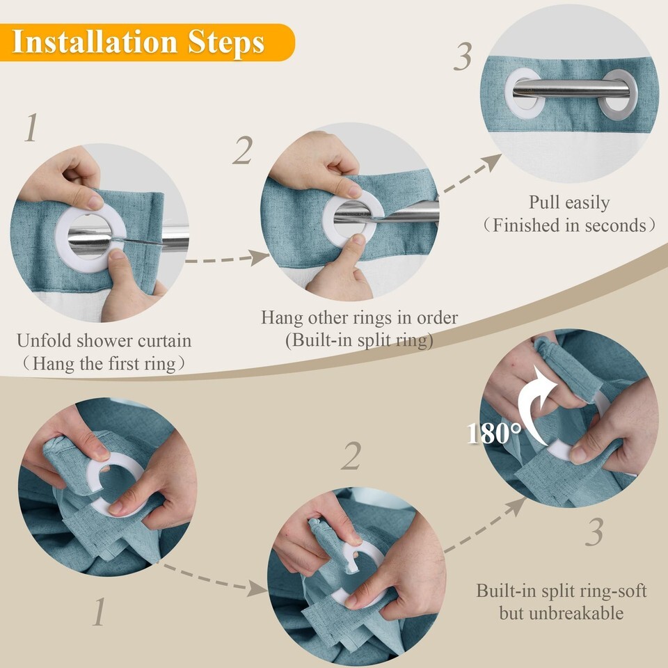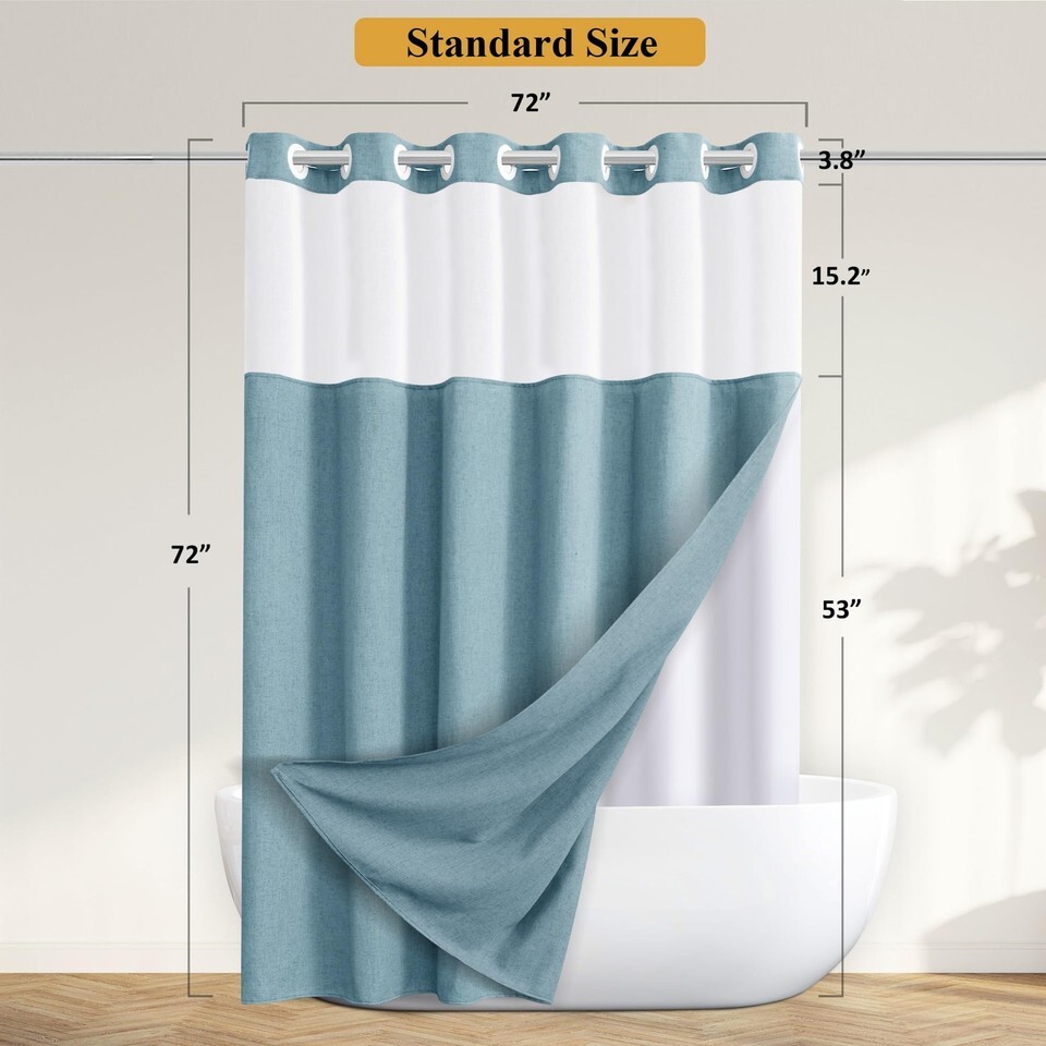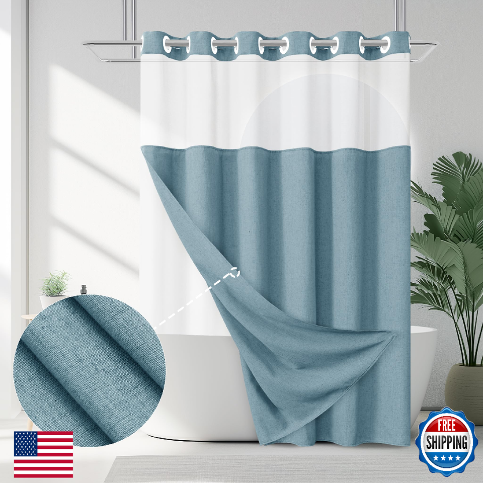 Jowels No Hooks Needed Linen Shower Curtain and Liner Set,Blue Hotel Luxury Deco