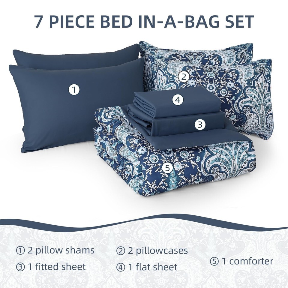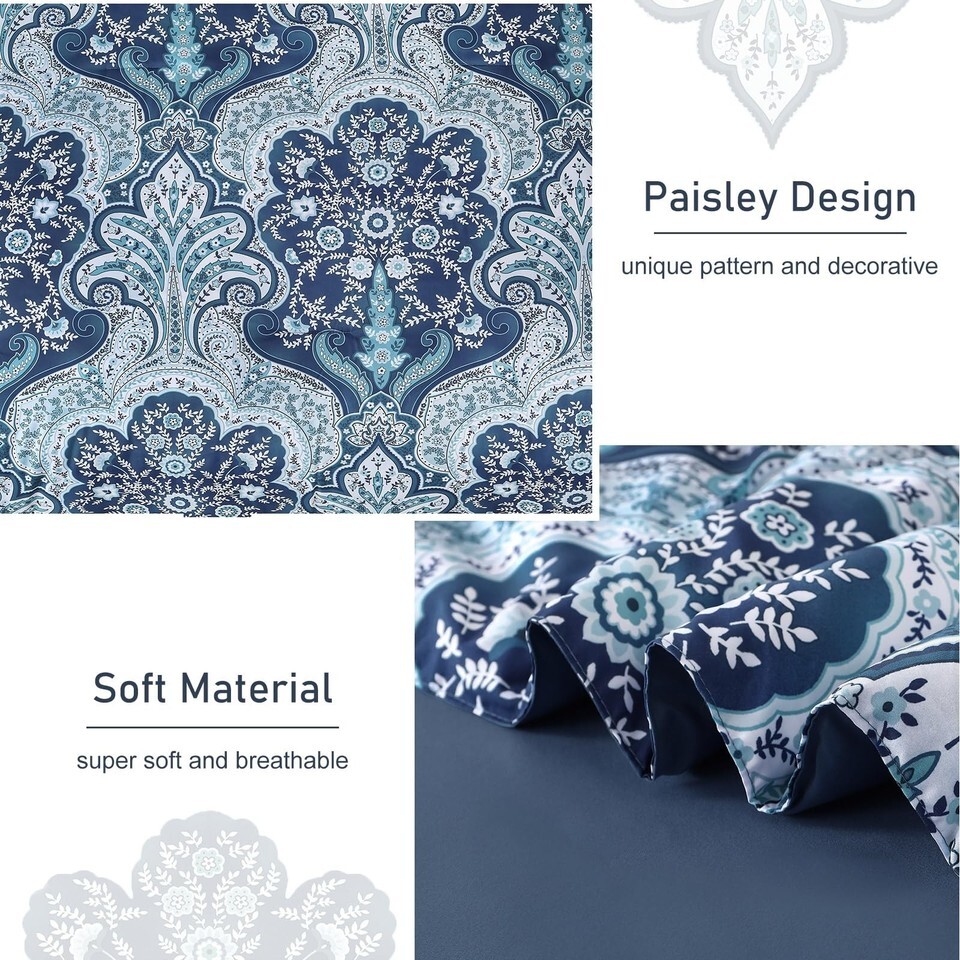 Drucon Paisley Comforter Set King Size 7 Pieces Bed in a Bag Blue Boho Microfibe