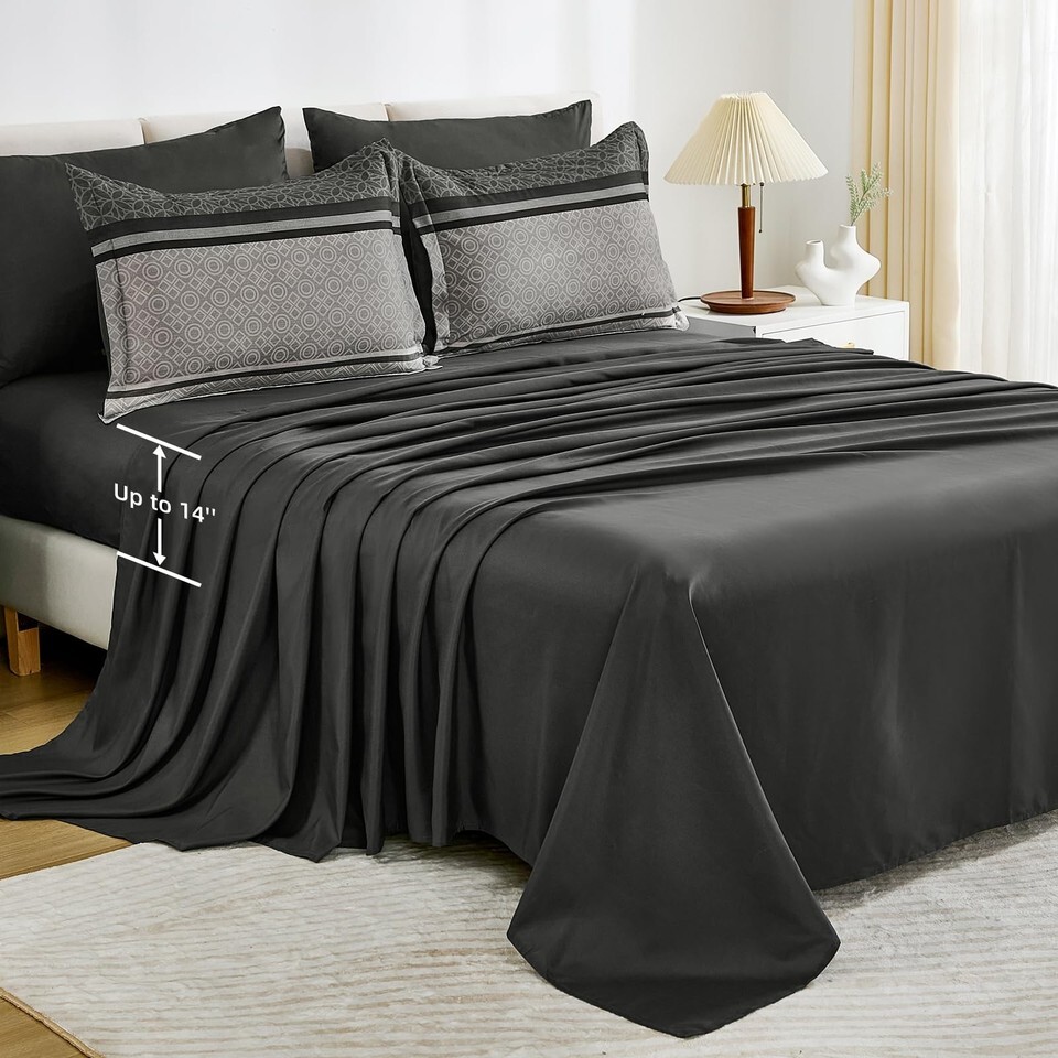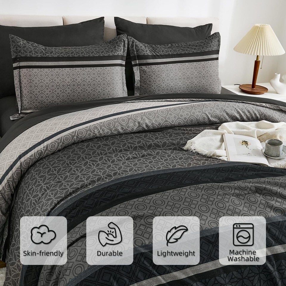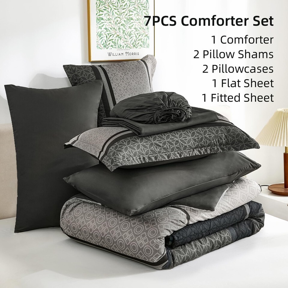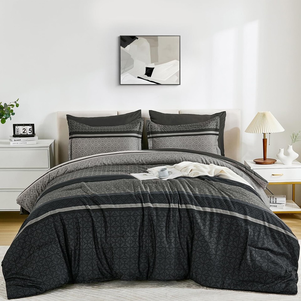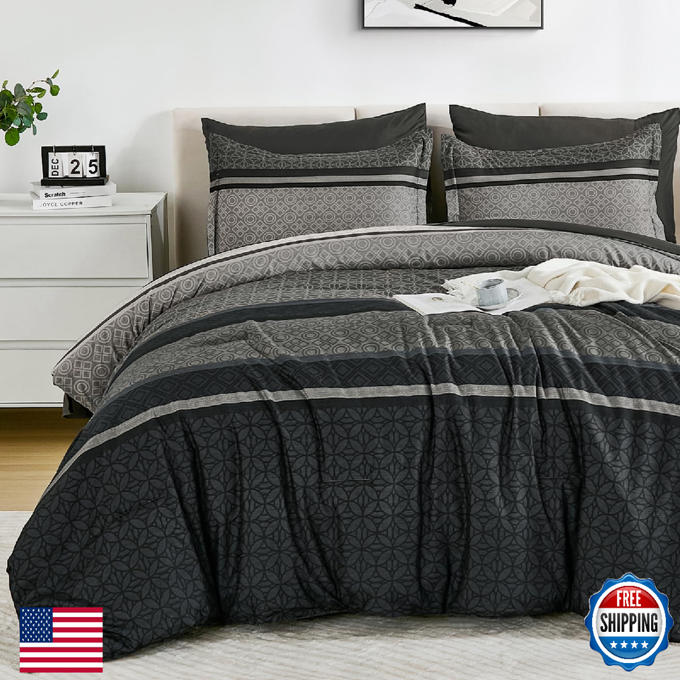 WONGS BEDDING King 7-Piece Dark Grey Black Striped Comforter & Sheet Set