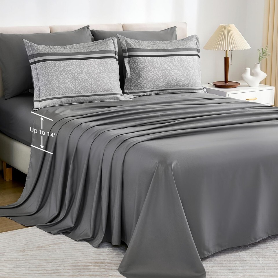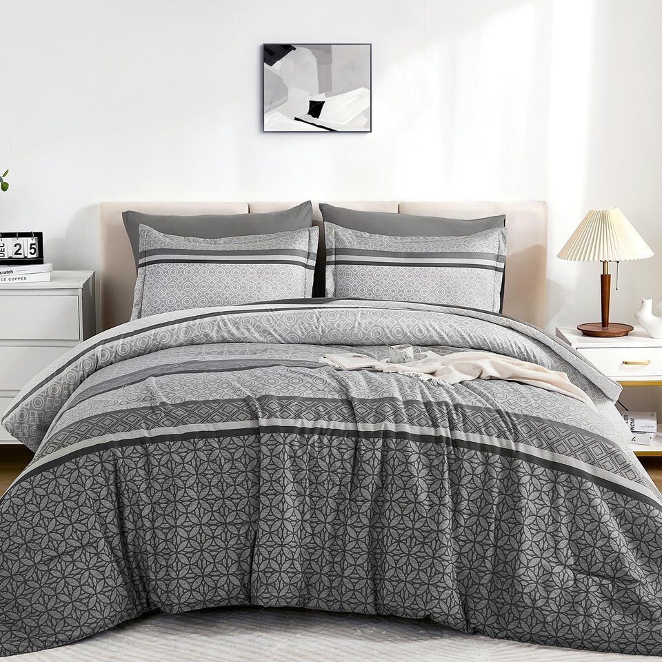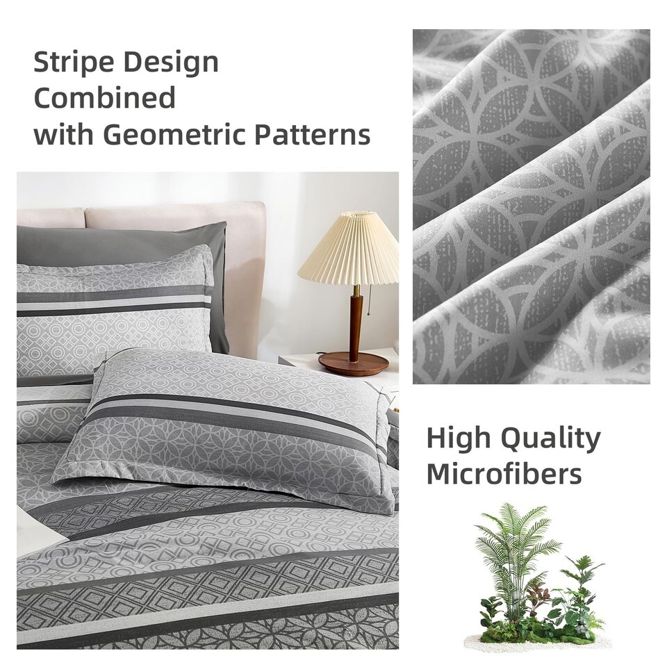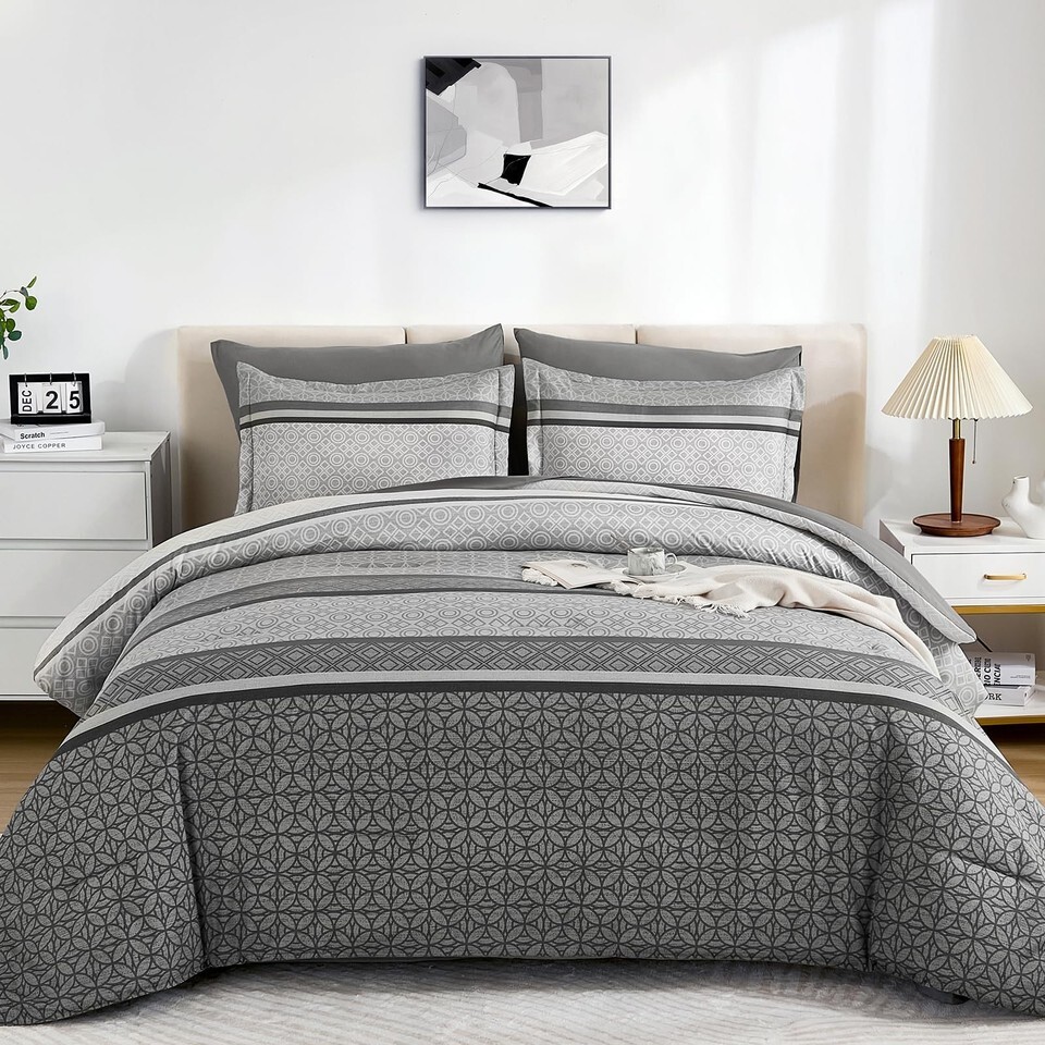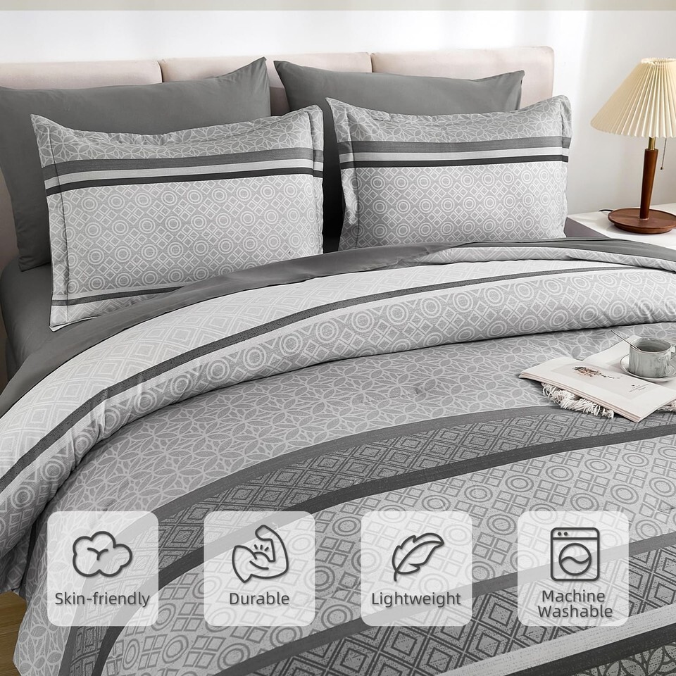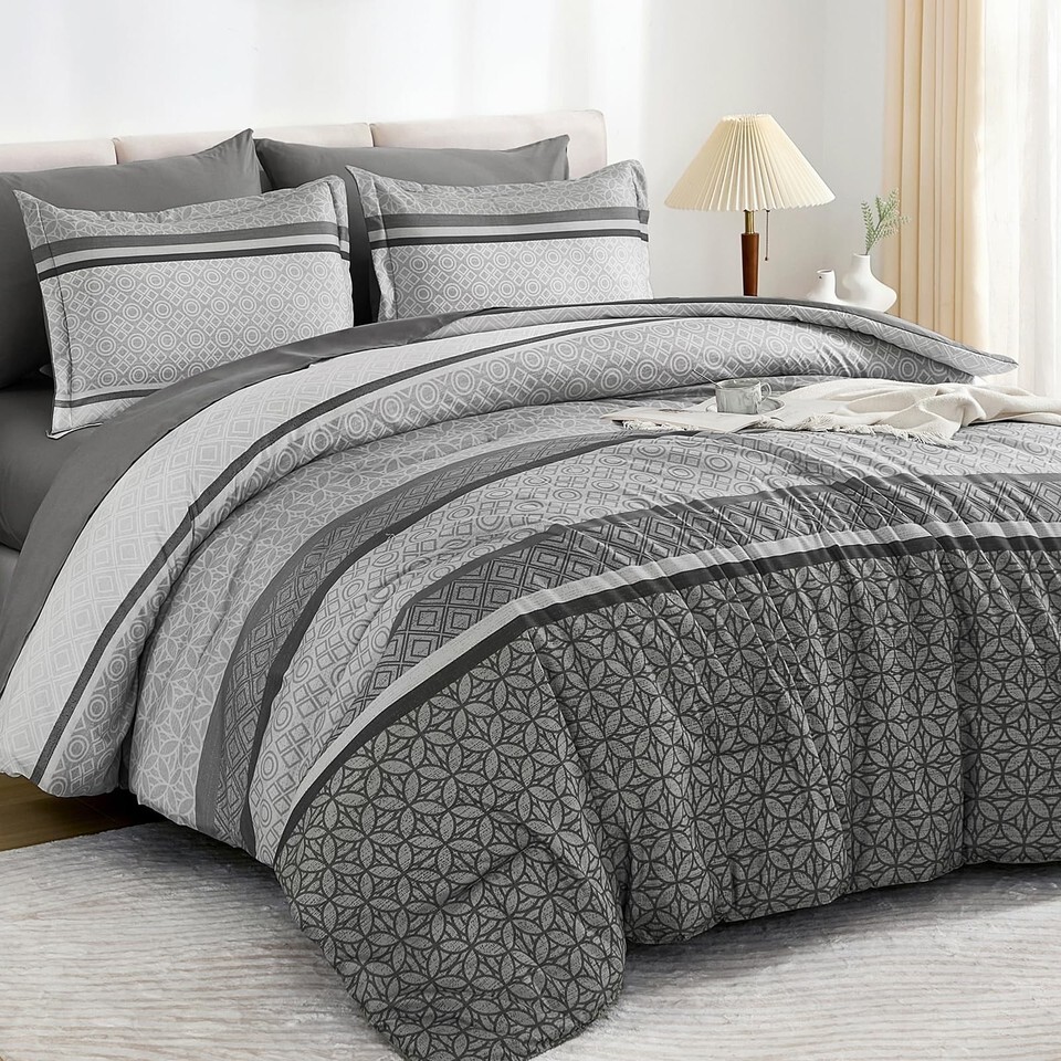 WONGS BEDDING Grey Queen Comforter Set 7 Pieces Striped Bed in a Bag Ultra Soft