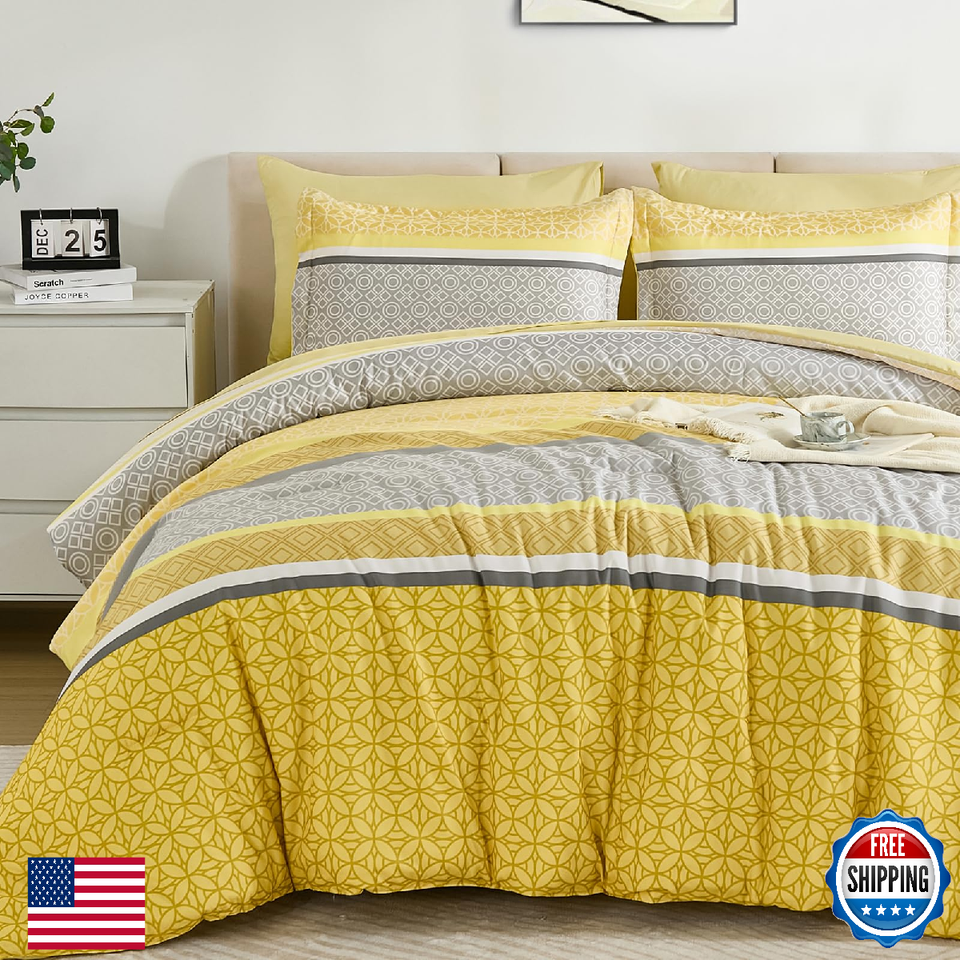WONGS King Yellow Striped Comforter Set 7pc w/Sheets Bohemian Microfiber