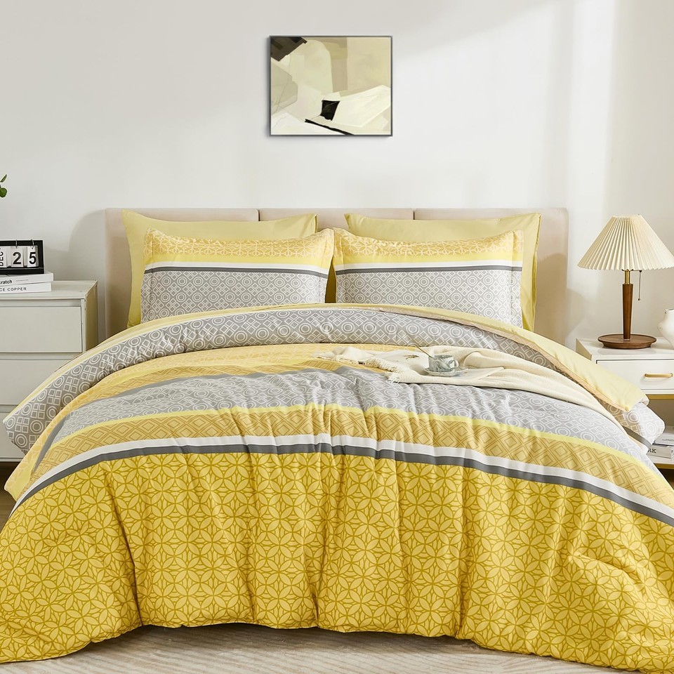WONGS BEDDING Yellow Comforter Set Queen Size 7 Pieces Striped Bed in a Bag Micr