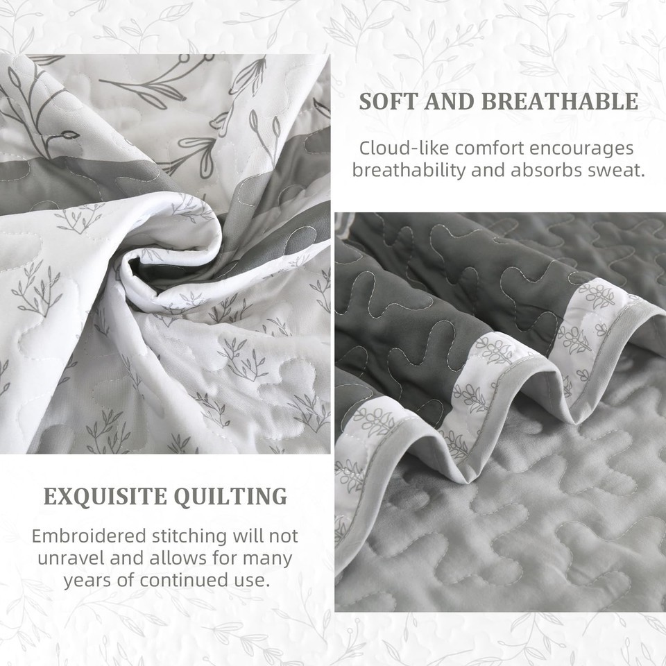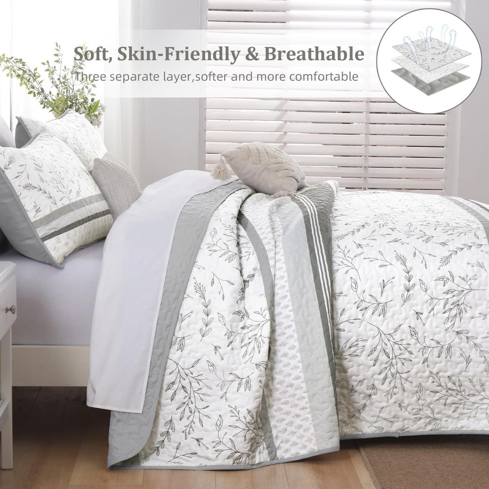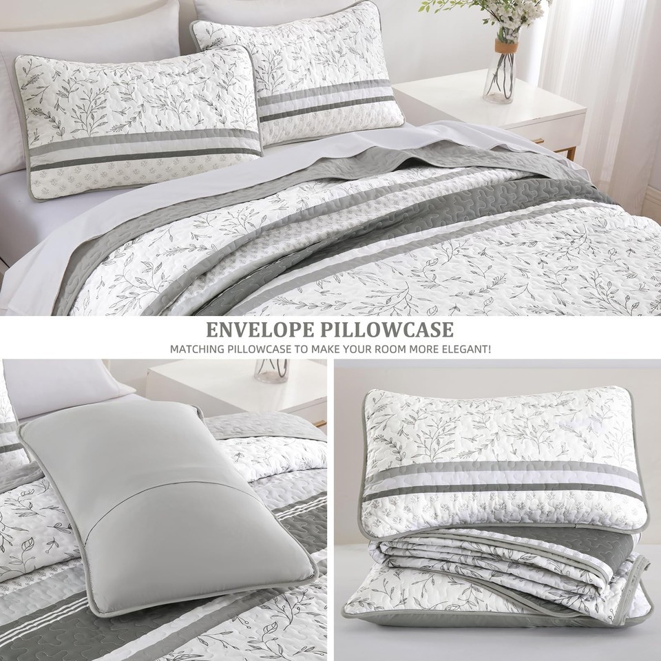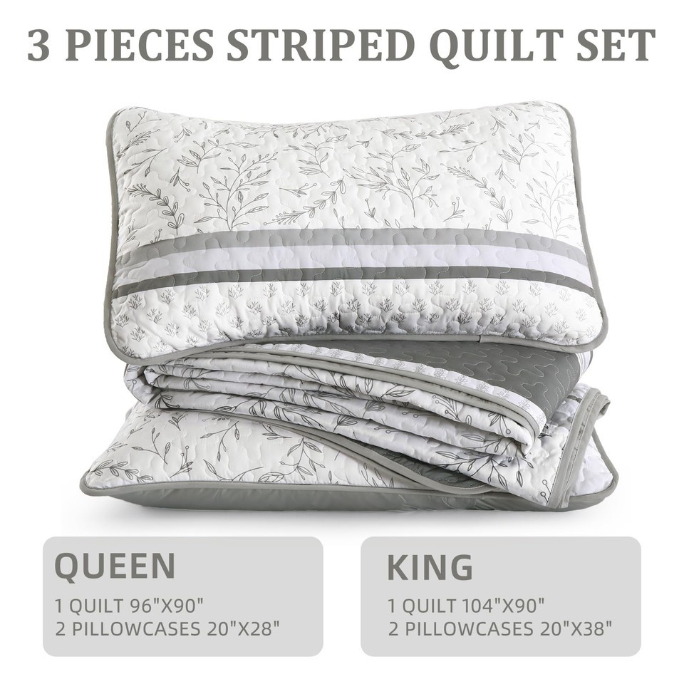 DJY Striped Quilt Set King Size, Grey Boho Striped Patchwork Leaves Printed Beds