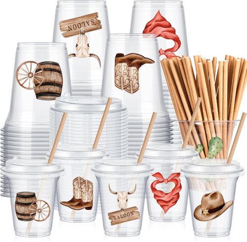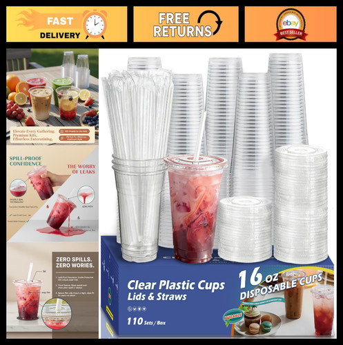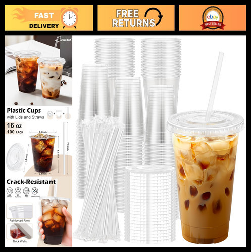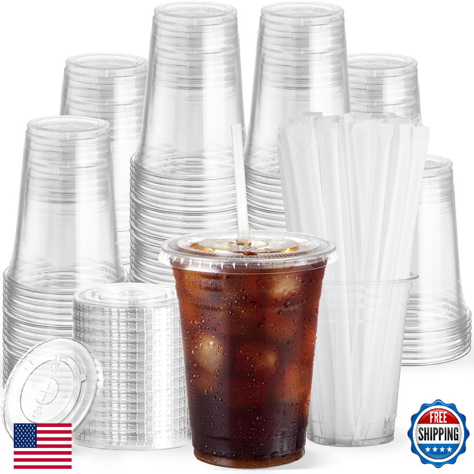 Boxential 100 Pack 16 oz Clear Plastic Cups with Lids and Straws, Disposable Cof