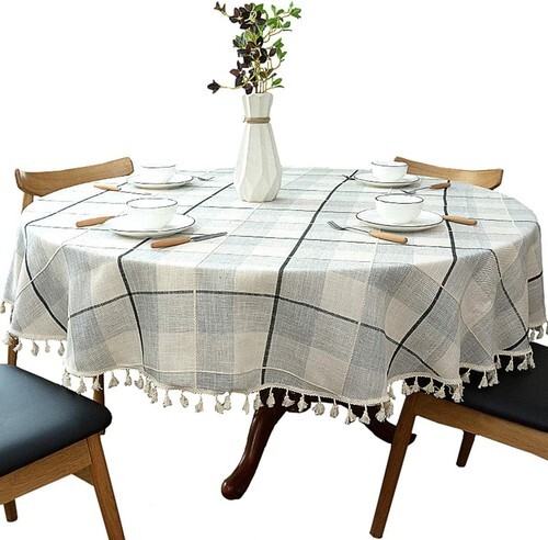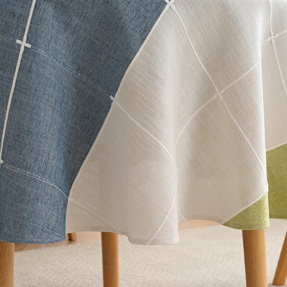 Yomeri Lattice Embroidery Plaid Round Tablecloth, Heavy Duty Cotton Linen Fabric