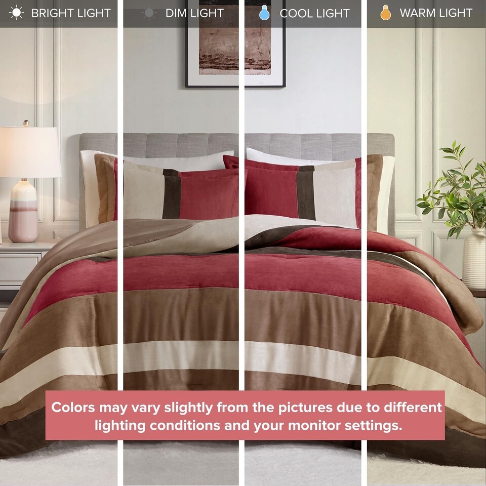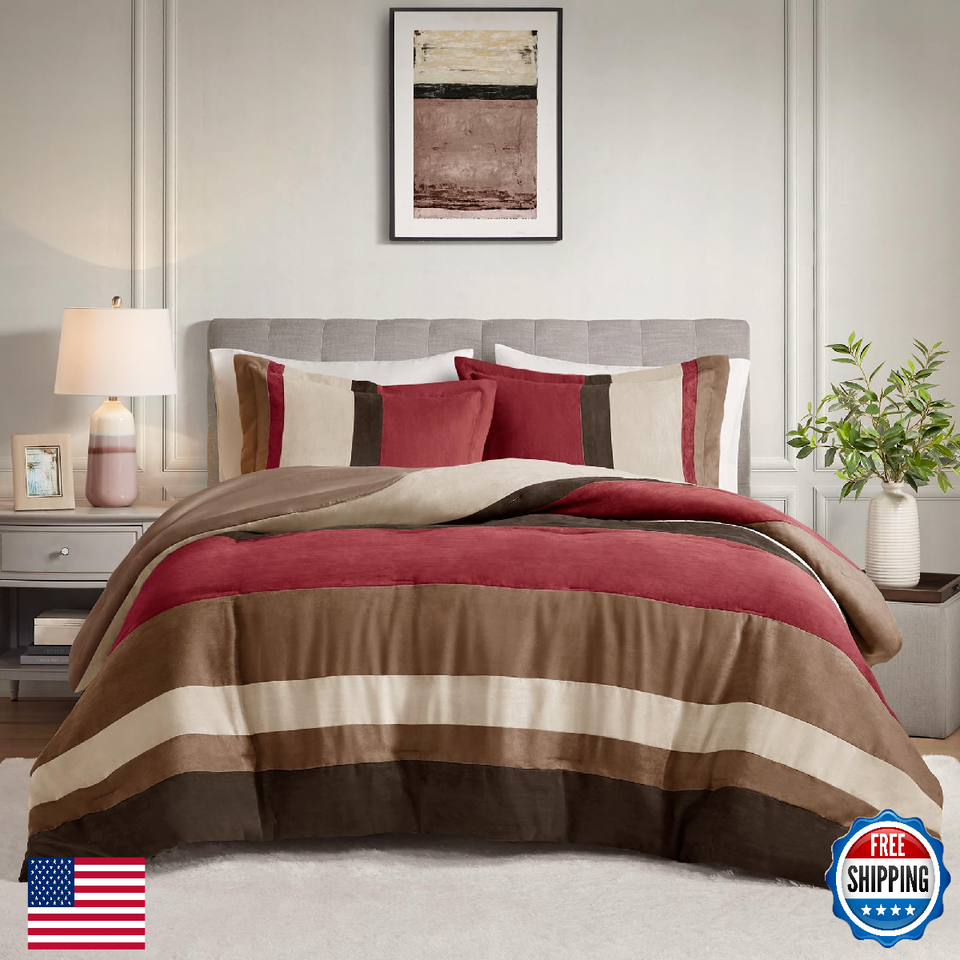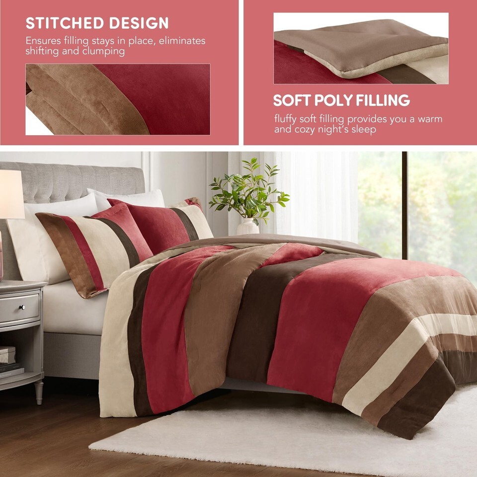 Comfort Spaces Luxe Microsuede Queen Comforter Set Red, 3 PC Pieced Color Block