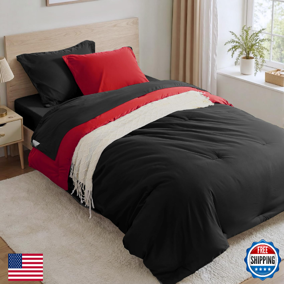 Anluoer Black Red Twin Comforter Set 5 Pieces Bed in a Bag Sheets Pillow Sham Pi