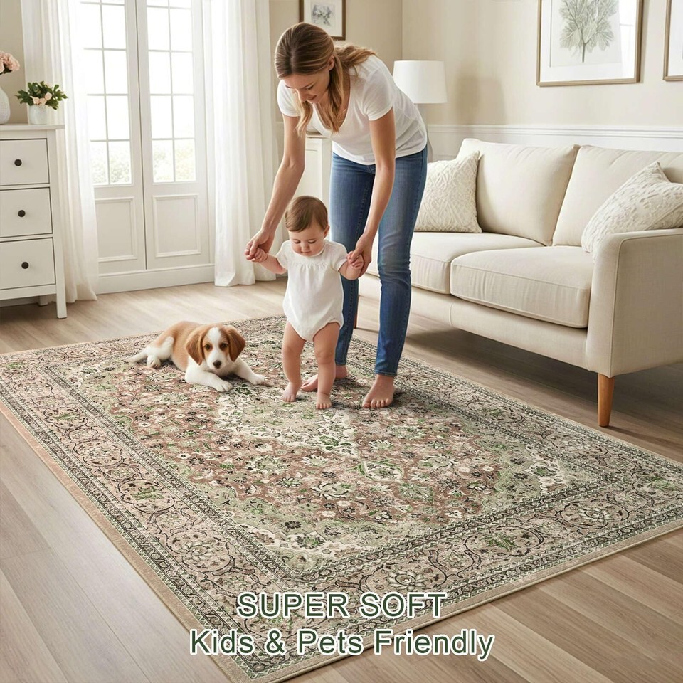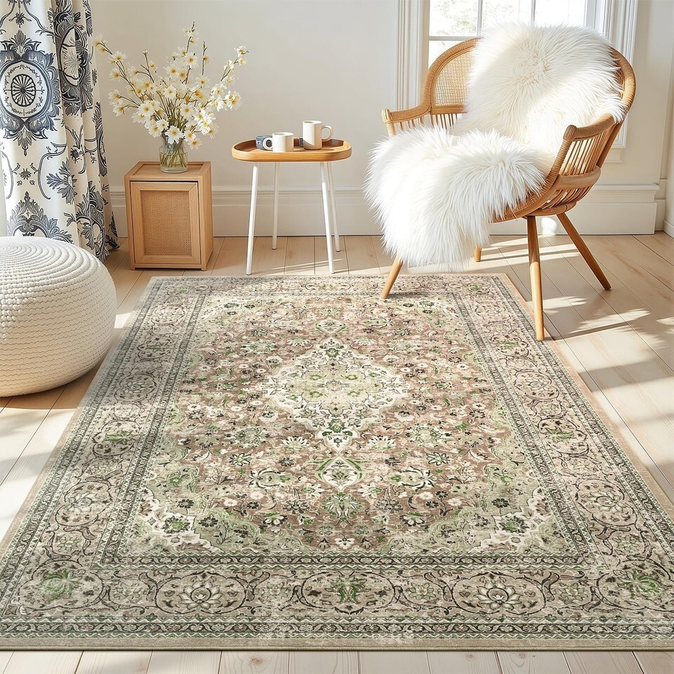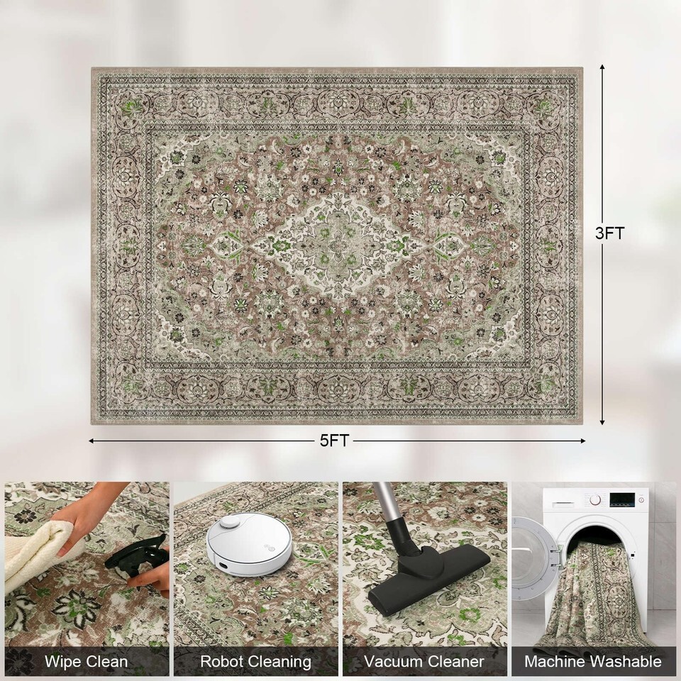 Flagover Green Washable Boho Area Rug for Bedroom, 3x5 Vintage Floral Non Slip R
