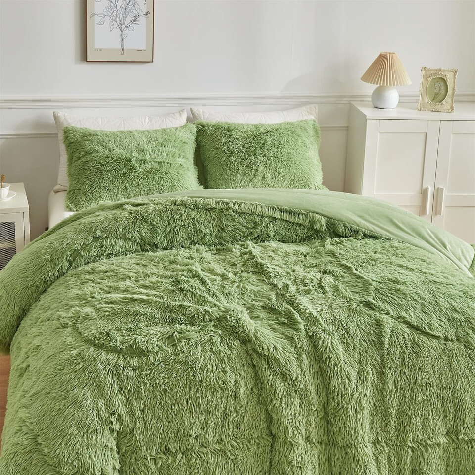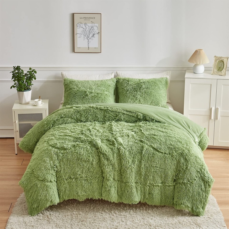 Wajade Faux Fur Plush Sage Green Comforter Set Fluffy Shaggy Bedding Set