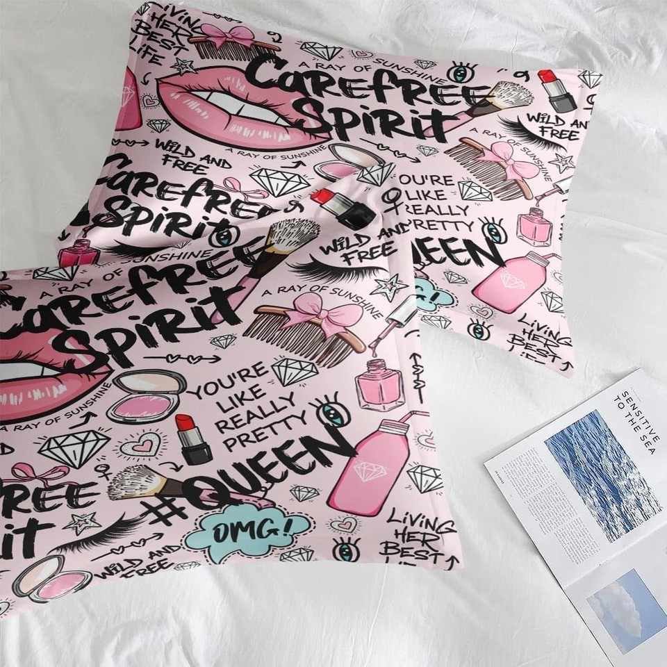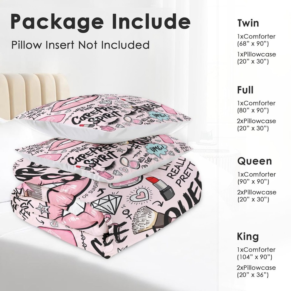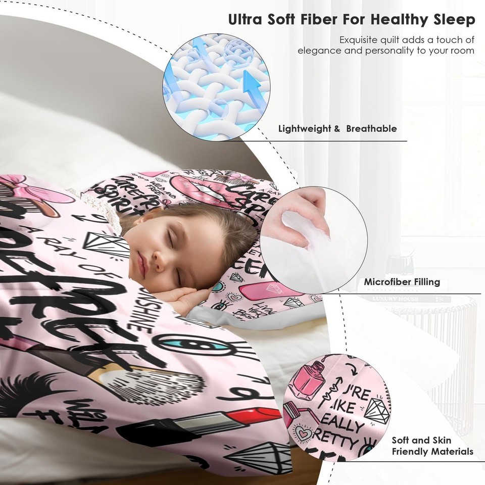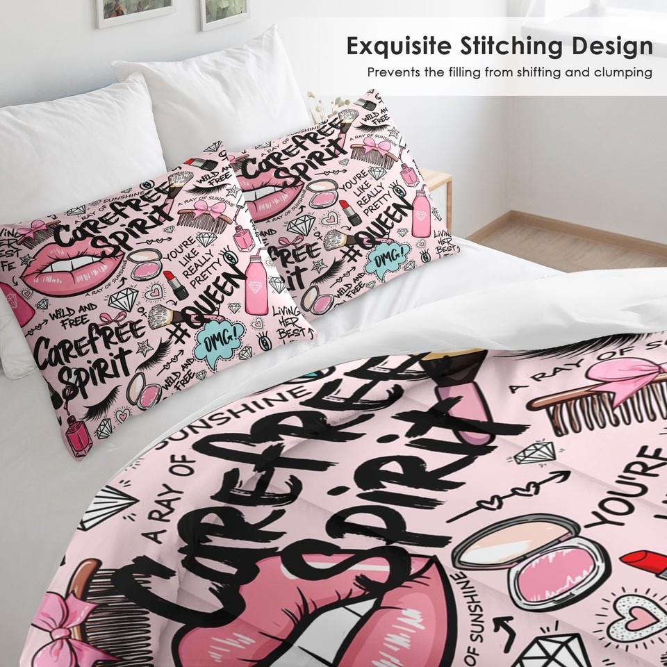 Pamnest Comforter Set Queen Size, Makeup Pink Queen Soft 3 Pcs Bedding for Kids