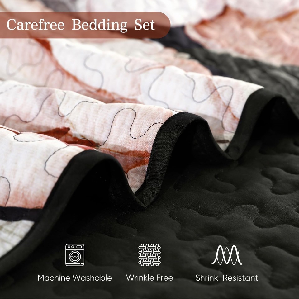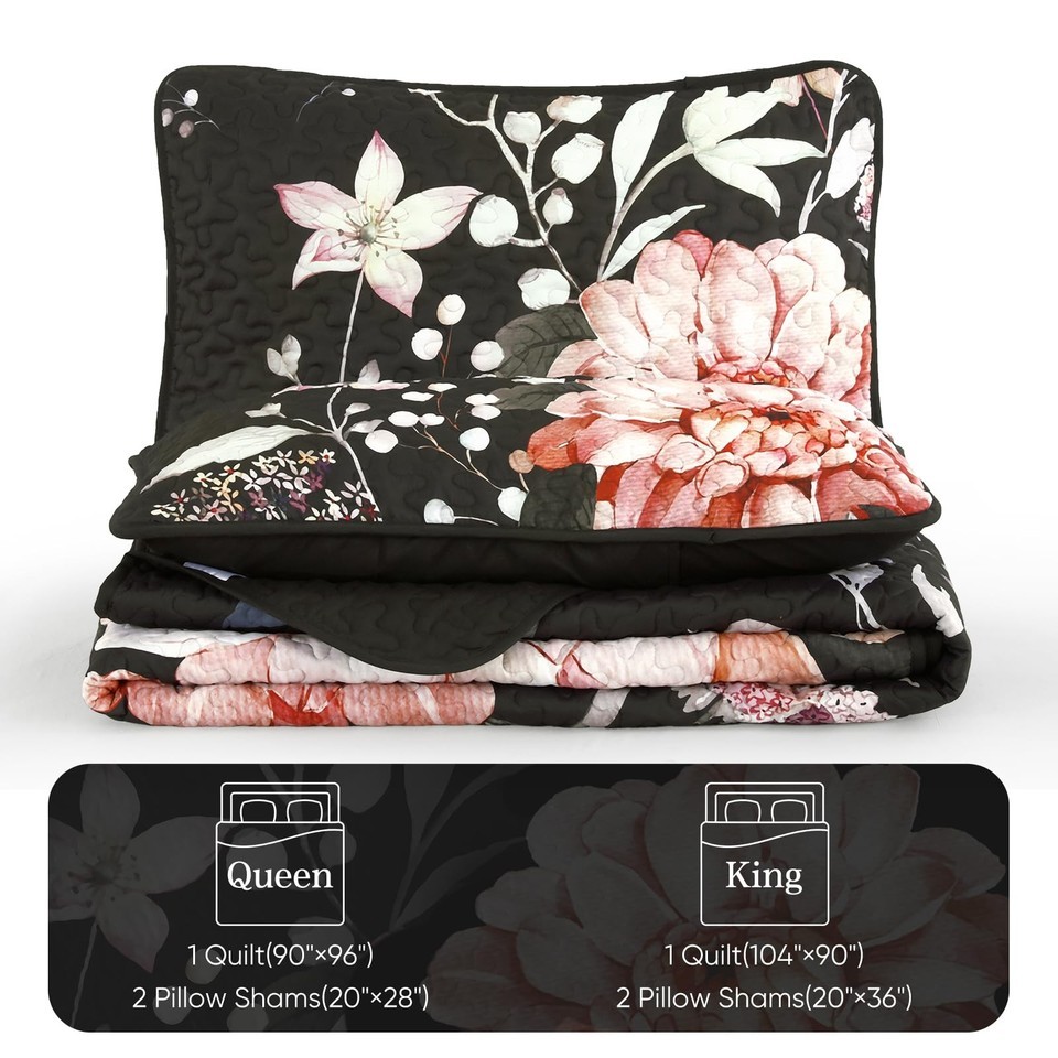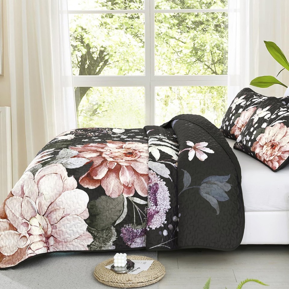 Drucon Floral Quilt Queen Size - 3 Pieces Black Quilt Botanical Bedspread Soft L