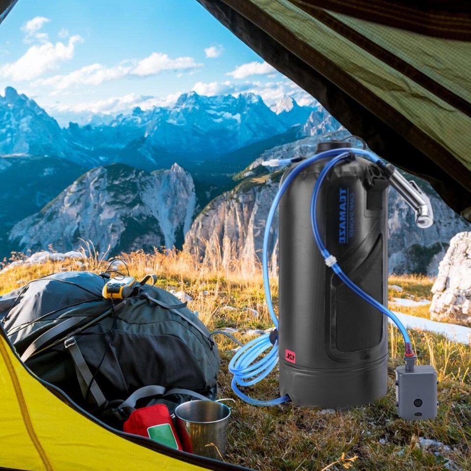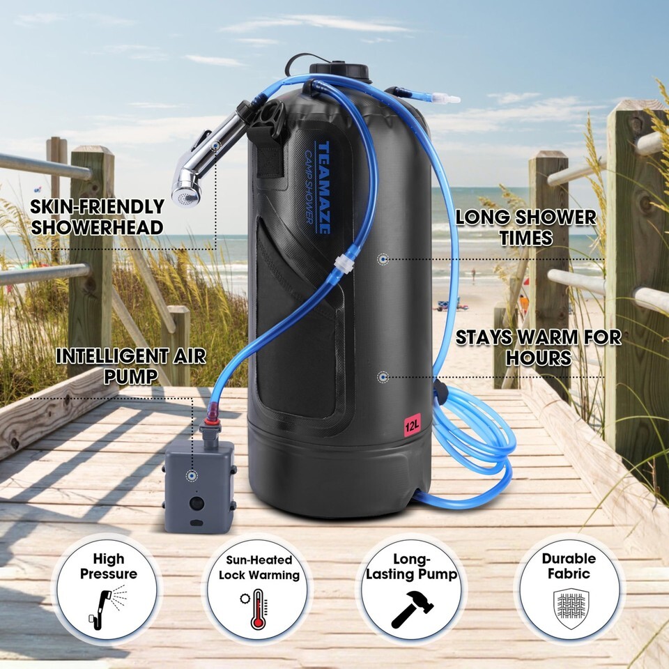 Teamaze 12L Portable Camping Shower Bag w/ Auto Pressure Pump & Solar Heating